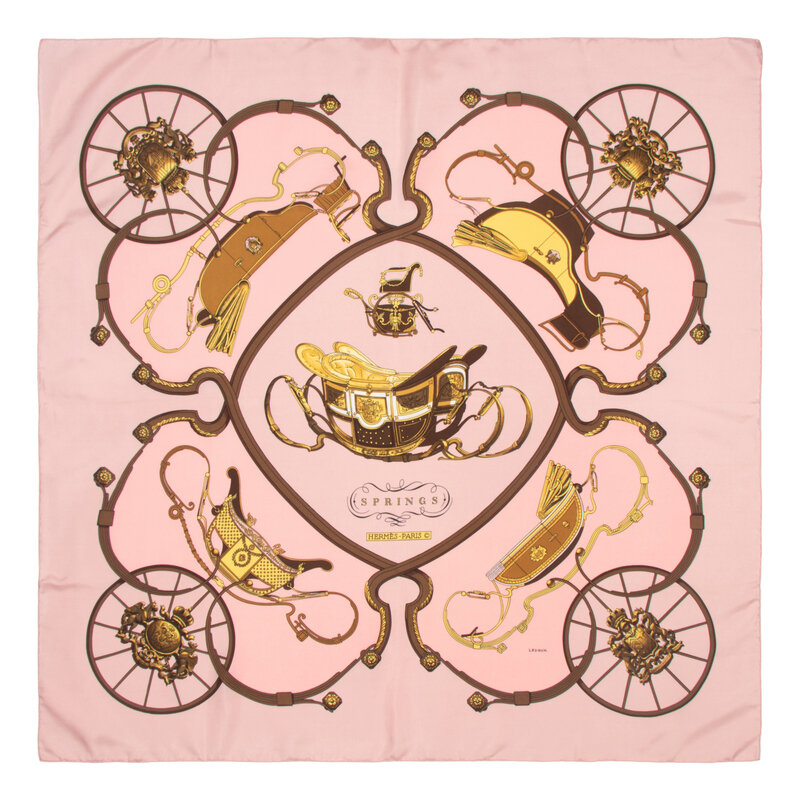 "Springs" Scarf 90 in printed silk twill. Features rolled and hand-stitched edges.
