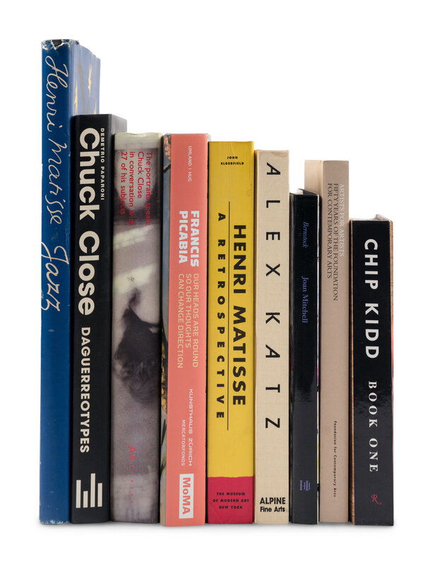 includes Alex Katz / The Complete Prints by Nicholas P. Maravell (1983), Artists for Artists / Fifty Years of the Foundation for Contemporary Arts (2013), Henri Matisse / A Retrospective by John Elderfield (1992), Joan Mitchell by Judith E. Bernstock (1988), Francis Picabia / Our Heads are Round so our Thoughts Can Change Direction by Anne Umland and Katherine Hug, Chip Kidd / Work 1986 - 2006 / Book One, The Portraits Speak : Chuck Close in Conversation with 27 of his Subjects (1997) with signed dedication from the Chuck Close, Chuck Close : Daguerreotypes by Demetrio Paparoni, with signed dedication by Chuck Close and Jazz by Henri Matisse (1983).
