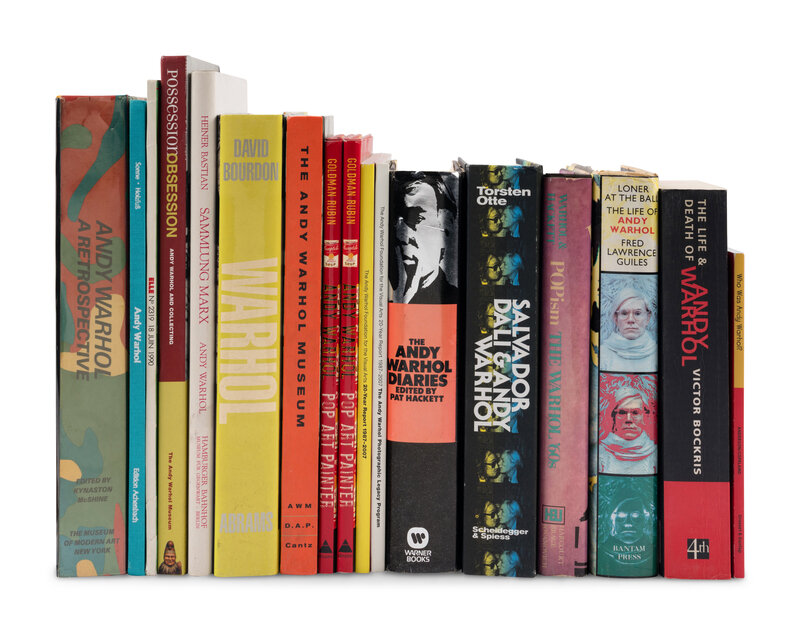 includes Loner at the Ball / The Life of Andy Warhol by Fred Lawrence Guiles (1989, with dedication by the author), POPism / The Warhol 60's by Andy Warhol and Pat Hackett (1980), Salvador Dali and Andy Warhol / Encounters in New York and Beyond by Torsten Otte (2016), The Andy Warhol Diaries edited by Pat Hackett (1989), The Andy Warhol Foundation for the Visual Arts 20-Year Report 1987-2007 (two volumes), Andy Warhol / Pop Art Painter by Susan Goldman Rubin (2006, two copies), The Andy Warhol Museum (1994), Posession/Obsession - Andy Warhol and Collecting (2002), Sammlung Marx / Andy Warhol / Fruhe Zeichnungen by Heiner Bastian (1996), a copy of Elle magazine No. 2319 (June 18th, 1990), Andy Warhol / Playbook of You S Bruce (Edition Achenbach), Andy Warhol / A Retrospective edited by Kynaston McShine (1989), The Life and Death of Andy Warhol by Victor Bockris (1998), Warhol by David Bourdon (1989), Who Was Andy Warhol by Kirsten Anderson (2014), Bang / Andy Warhol Early Pop Drawings 1952-1962 published by Hirschl & Adler Modern (2014) and Pittsburgher Magazine Vol. 3 No 12, May 1980.