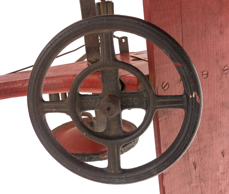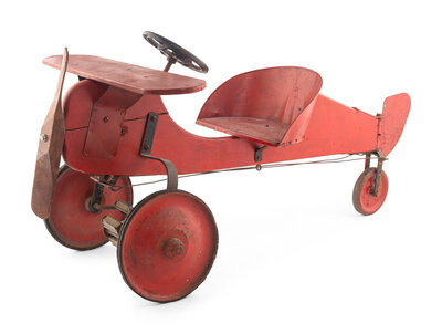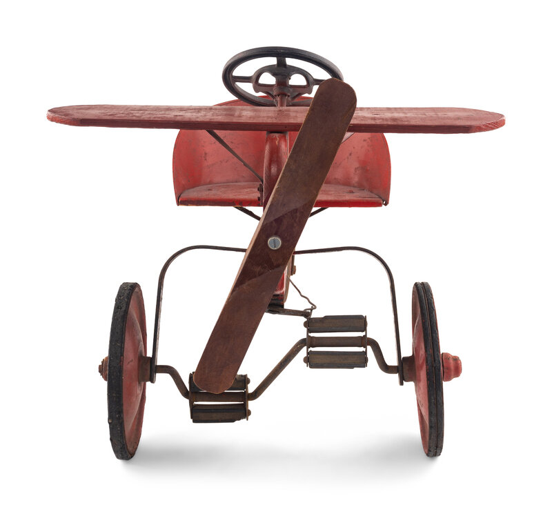 having a steel steering wheel with wooden tail, wings, and propeller.