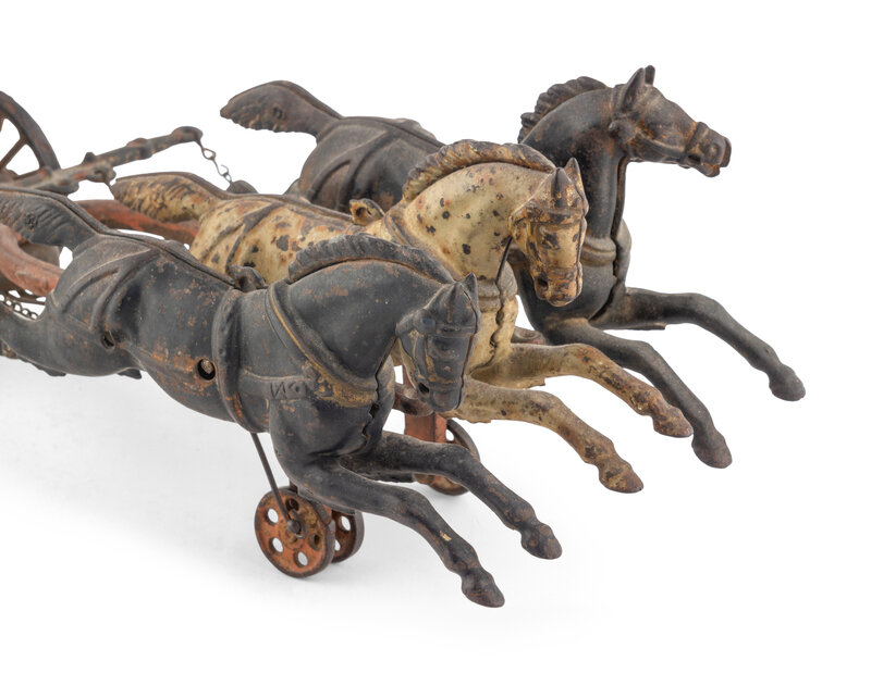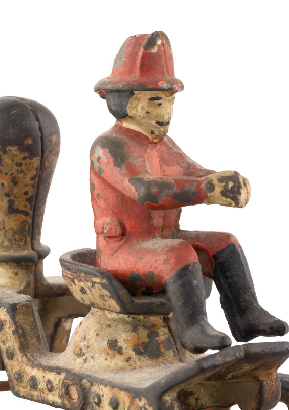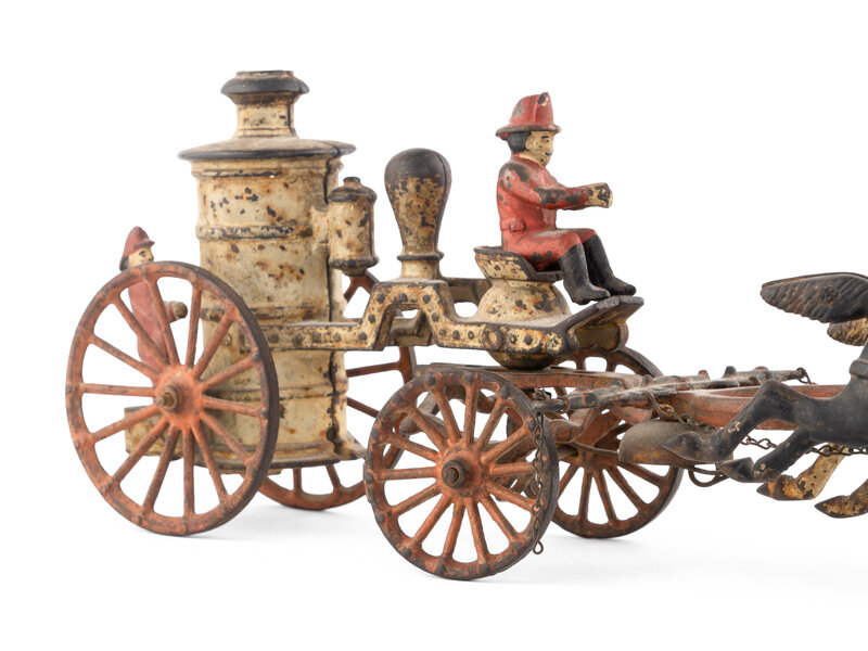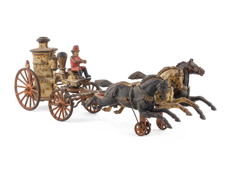 A Cast Iron Fire Engine Three-Horse Train and a Horse Pull Toy