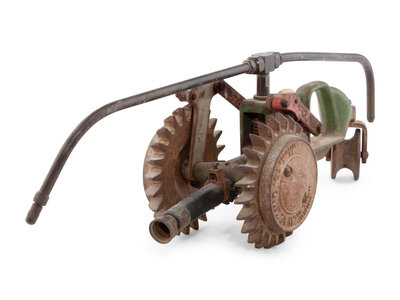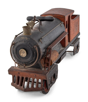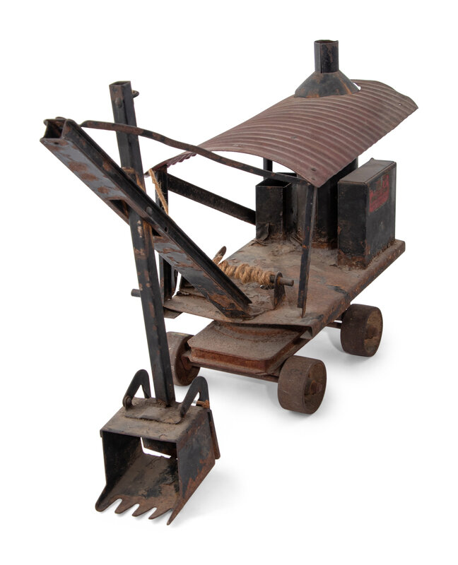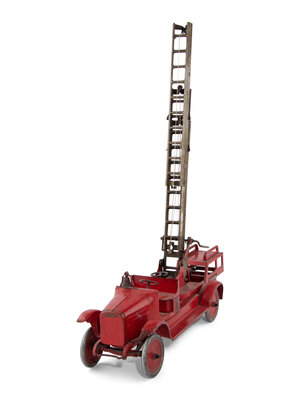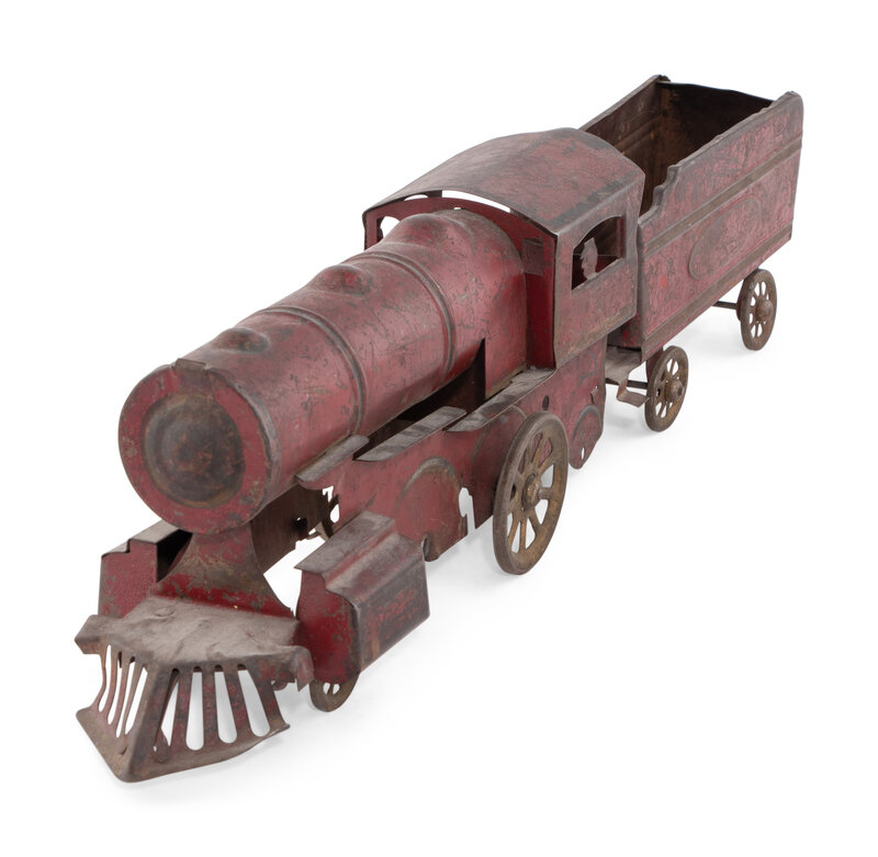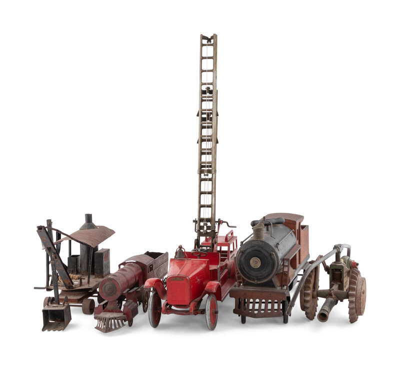 comprising a red-painted Buddy L Aerial Truck, a Keystone ride-on train engine, a pressed tin steam locomotive, a cast iron National Walking Lawn Sprinkler Model A5, and a Buddy L steam shovel.