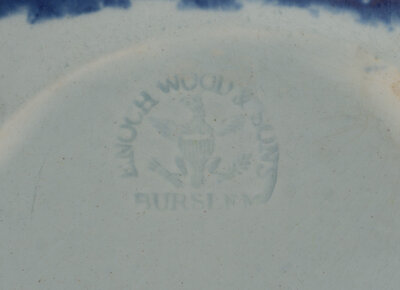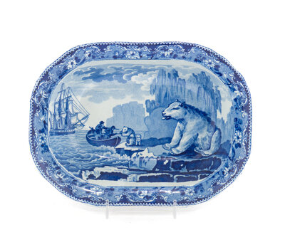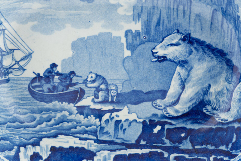 dark blue on white depicting a polar bear hunt, impressed 'Enoch Wood & Sons, Burslem, England' on underside.