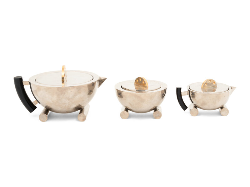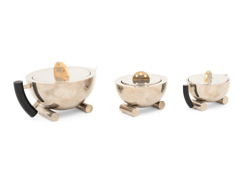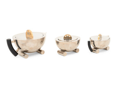 In the style of Marianne Brandt (German 1893-1983), comprising a teapot, creamer, and covered sugar; 3 items total