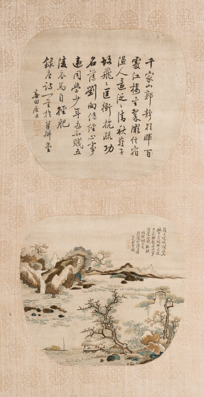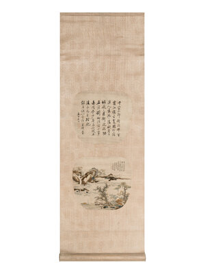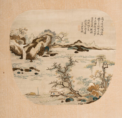 Finely worked by the famous female embroiderer Pan Qiuyun, embroidered landscape in the style of painter Wang Hui (1632-1717), with a postscript to the upper part of the scroll by artist Xu Chuntian (late 19th century).