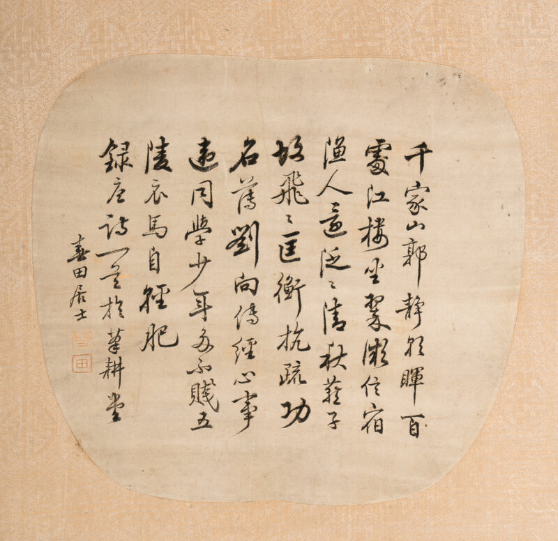 款識:嶺上嵯峨瀉瀑出,樹中虛閣依長流。日長睡起無些事,消受江南一段秋。仿耕煙外史(王翬,1632-1717)法寫於得月樓。女史秋雲鍼。