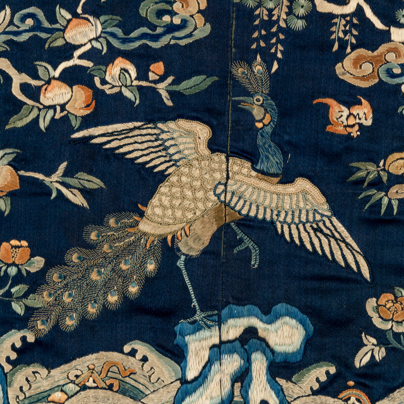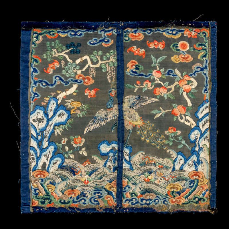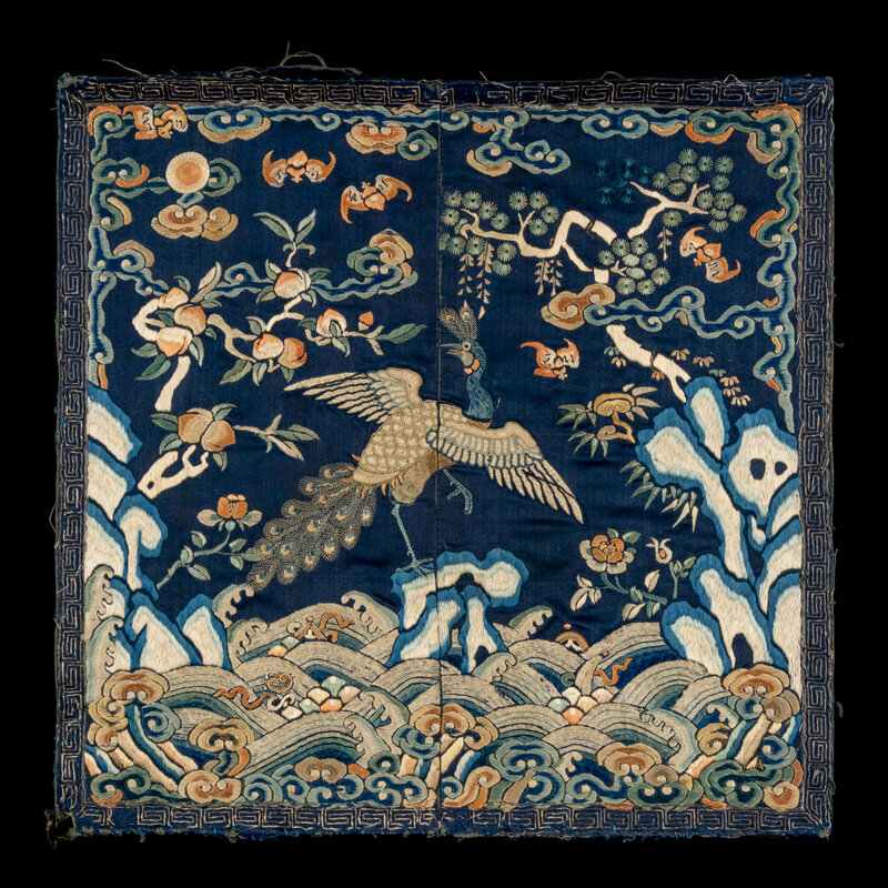 This front badge is embroidered on the dark blue ground in colored silks with a peacock above foaming waves and amongst cloud scrolls, Buddhist symbols, and peaches.