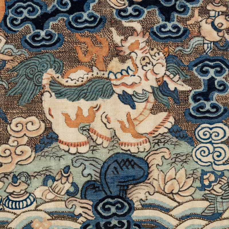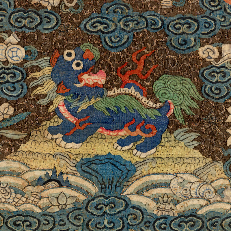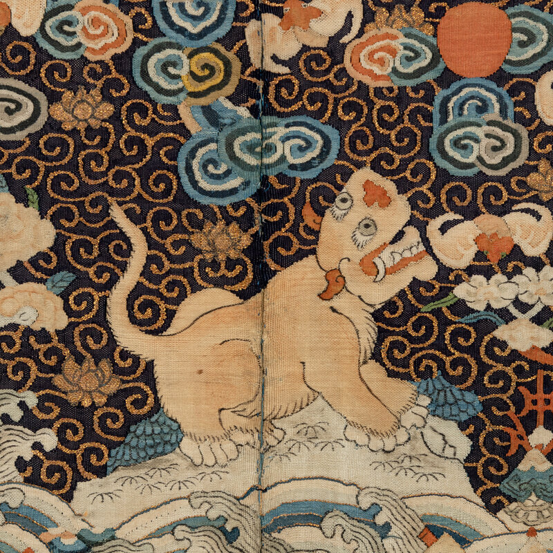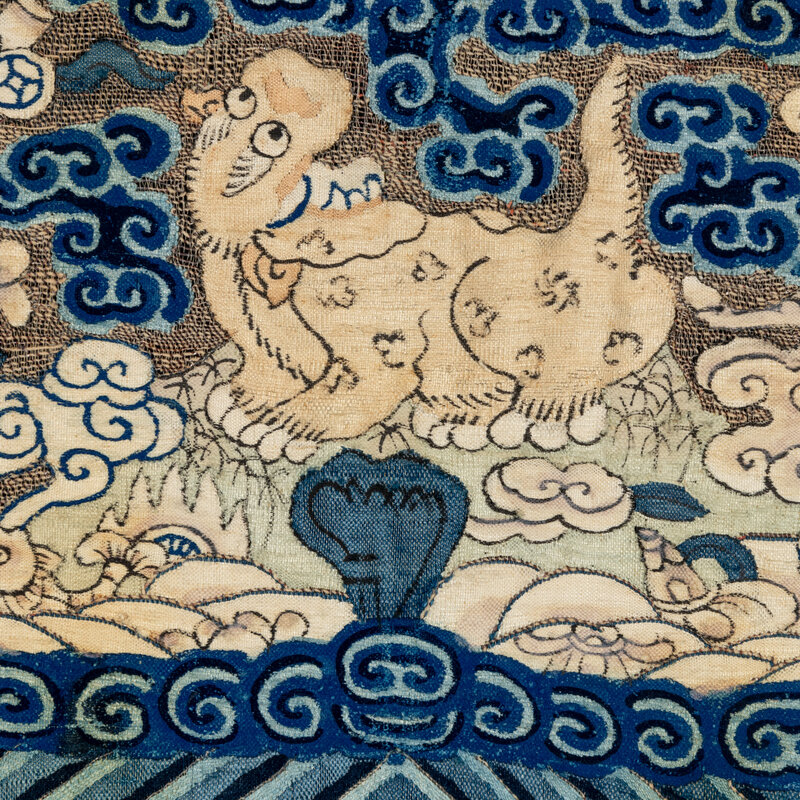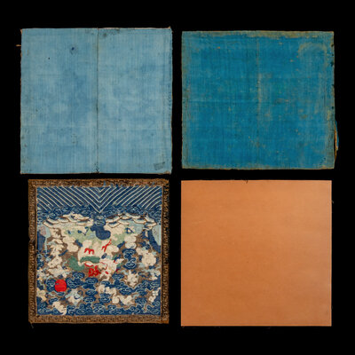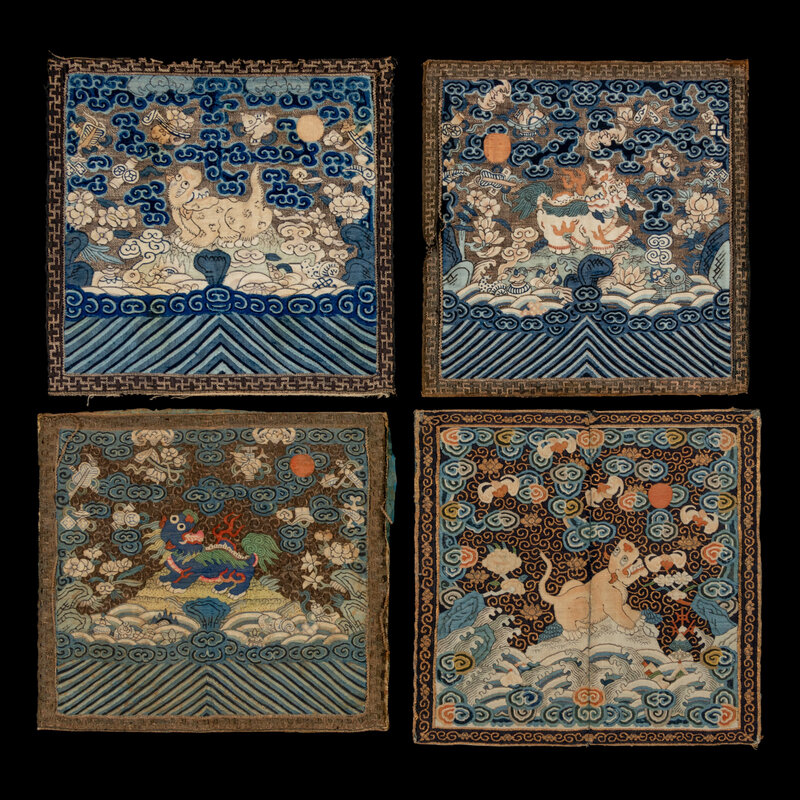 Comprising a panther badge, Daoguang period (1821-1850), a bear badge, a leopard badge and a xiezhi badge, Tongzhi period (1862-1874). Each is woven with a beast in the center reserved on a gold ground embellished with blue clouds and auspicious symbols, shown facing the sun as it alights on a rock amongst foaming waves.