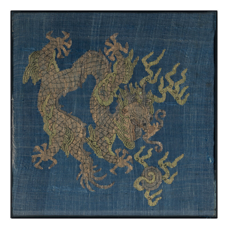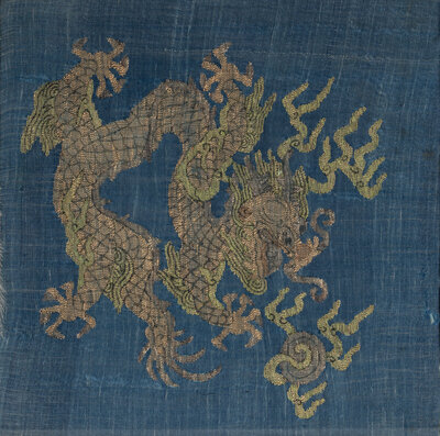 晚清-民國 捻金地龍紋綉片一對及藍地龍紋緙絲一幅