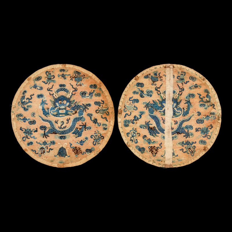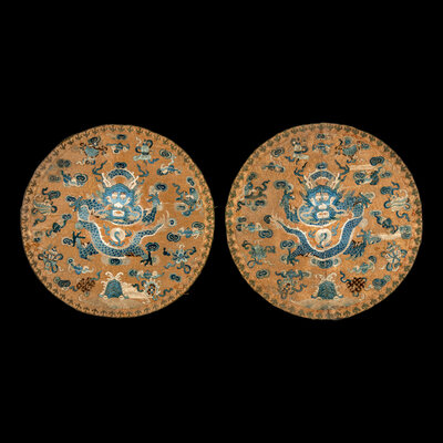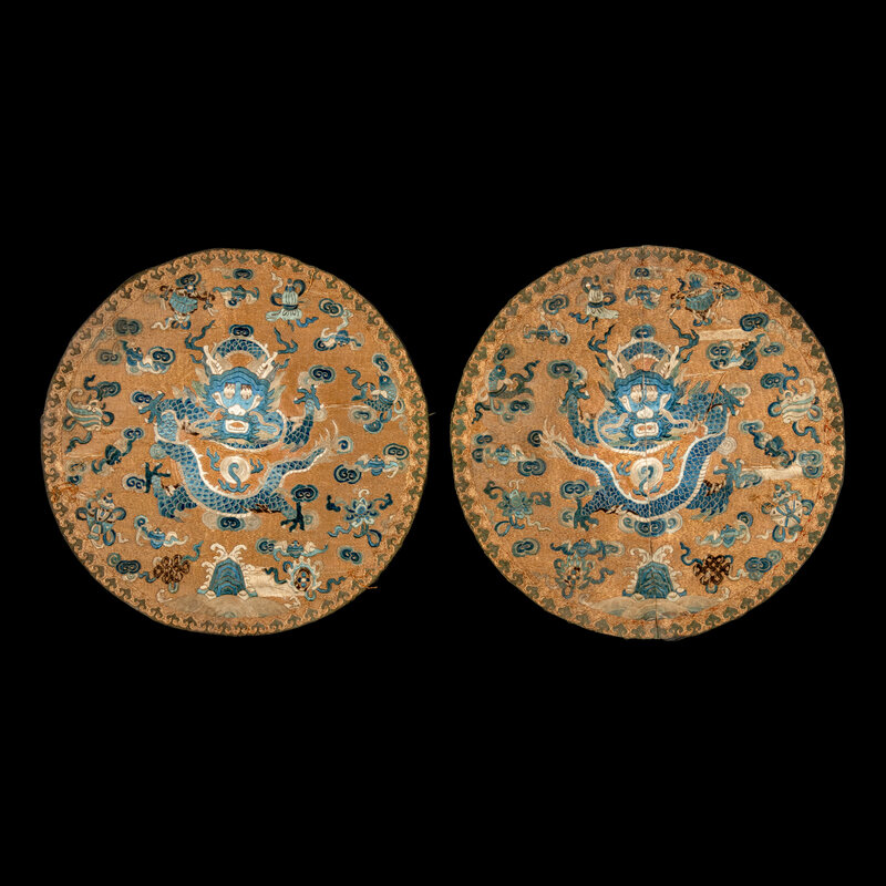 The first a pair of gold ground embroidered silk roundels, the second a square blue ground kesi silk example.