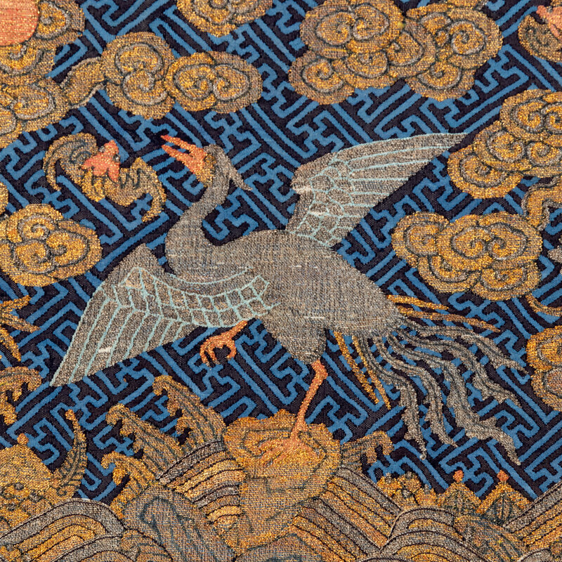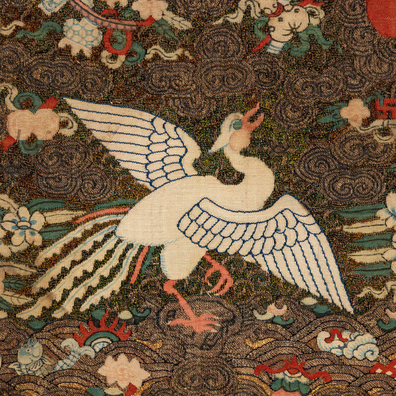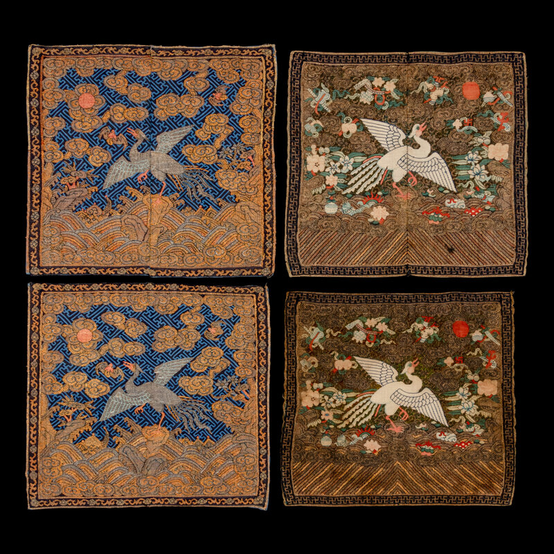 Comprising a smaller pair from the Xianfeng period (1851-1861), a larger pair from the Guangxu period (1875-1908). Each is made for a civil official of the fifth rank. The bird is shown facing the sun as it alights on a rock amongst foaming waves, reserved on a gold ground embellished with clusters of clouds and auspicious symbols.