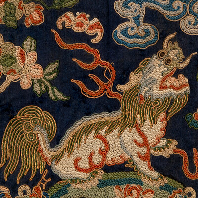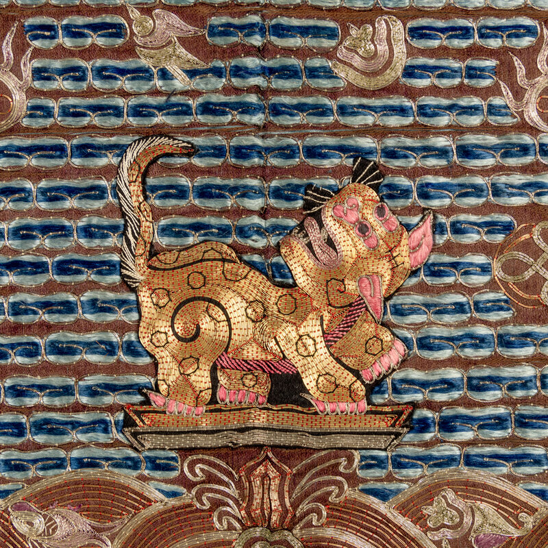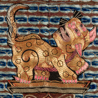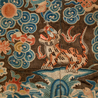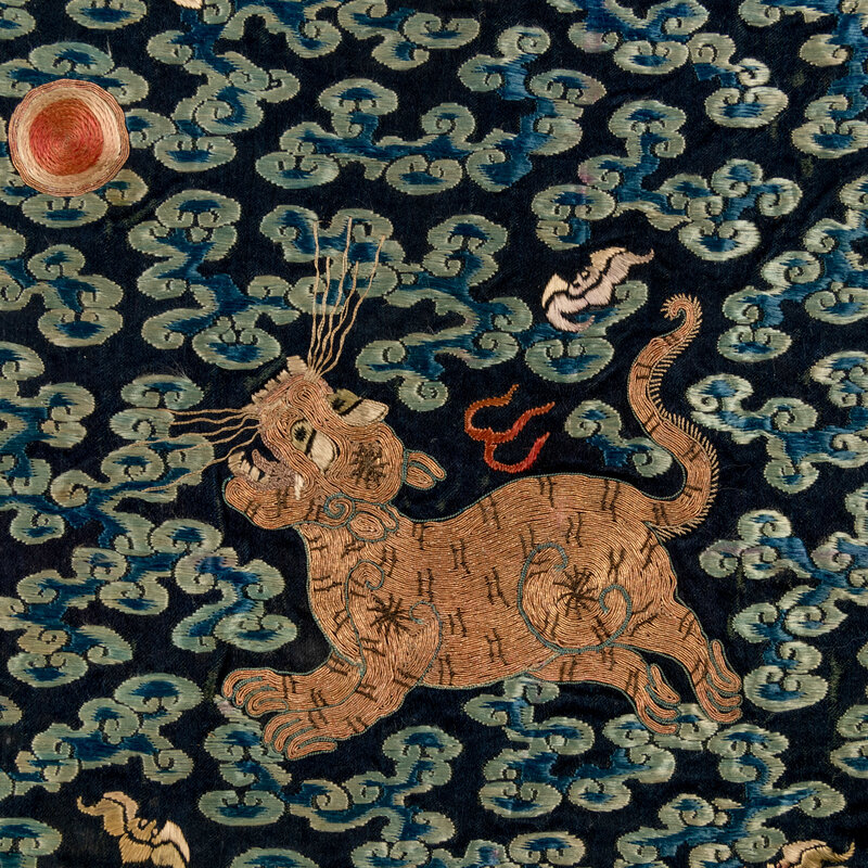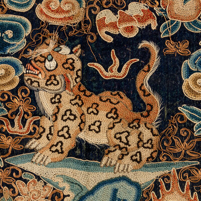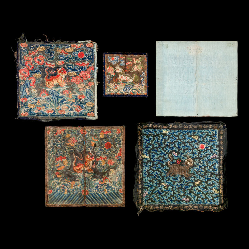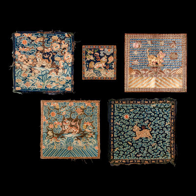 Comprising a leopard badge and a small xiezhi badge, Daoguang period (1821-1850), a tiger badge, Xianfeng period (1851-1861), a tiger badge and a leopard badge, Guangxu period (1875-1908). Each is embroidered with a beast in the center, shown facing the sun as it alights on a rock amongst foaming waves. Each is reserved on a gold ground embellished with blue clouds and auspicious symbols.