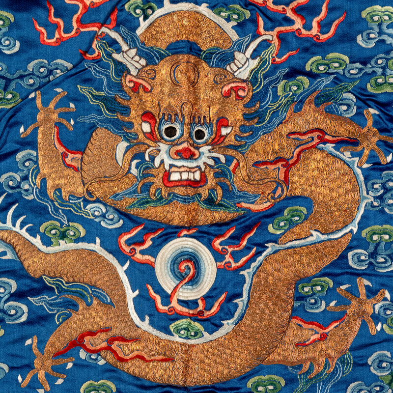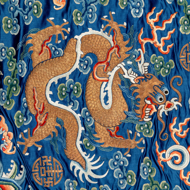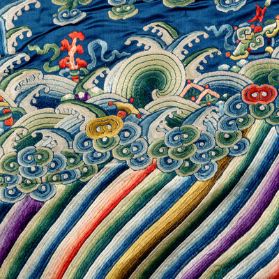 Worked in couched gold thread and fine counted stitch with nine five-clawed dragons pursuing flaming pearls amidst blue and green clouds interspersed with bats and the Eight Daoist Emblems (baxian) above a wide terrestrial diagram and lishui stripe.