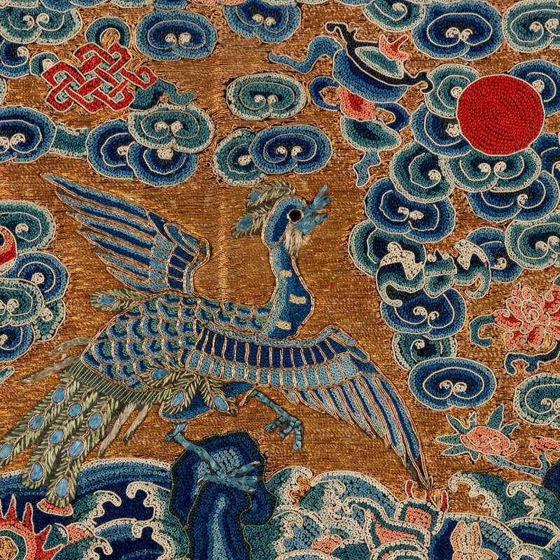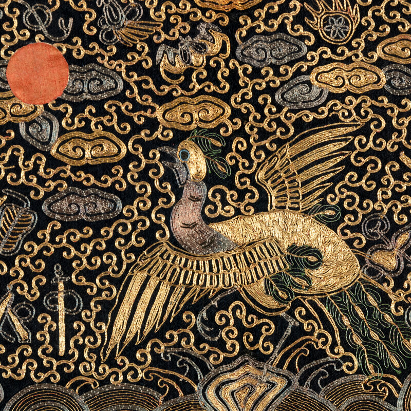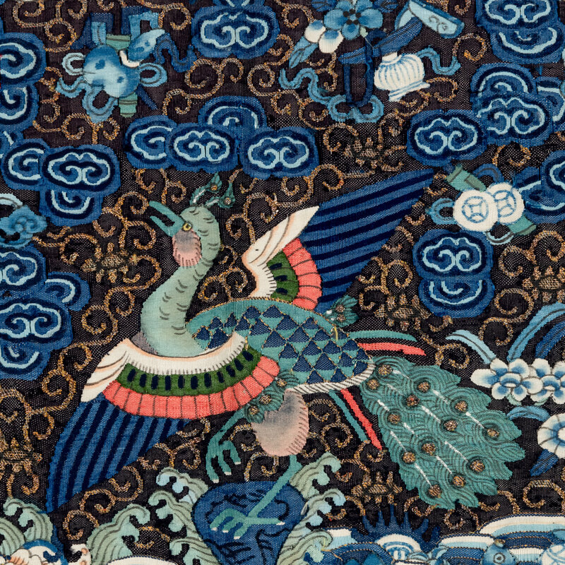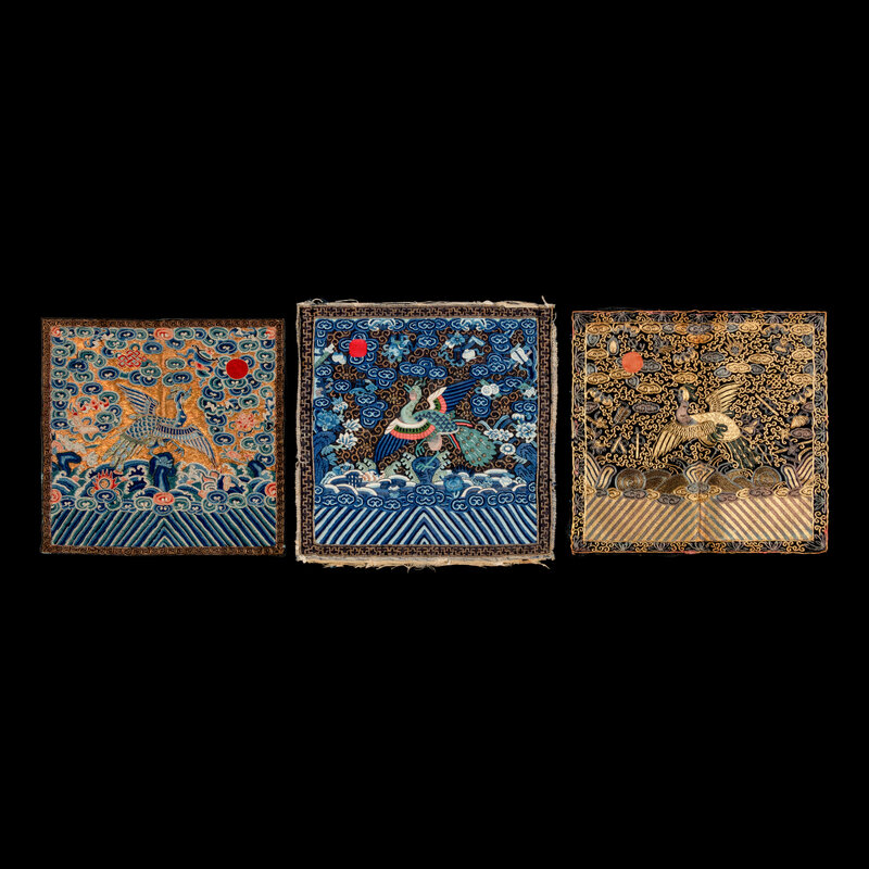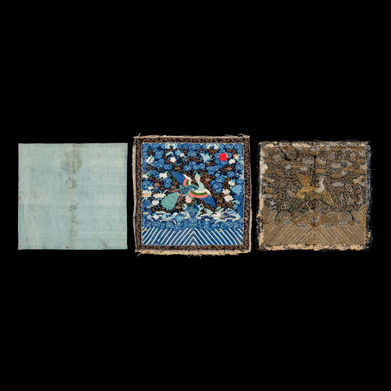 Comprising one gold metallic ground example, Xianfeng period (1851-1861), one kesi and one gold metallic thread example, Tongzhi period (1862-1874). Each made for a civil official of the third rank.