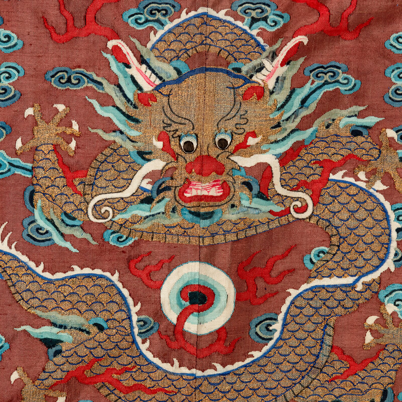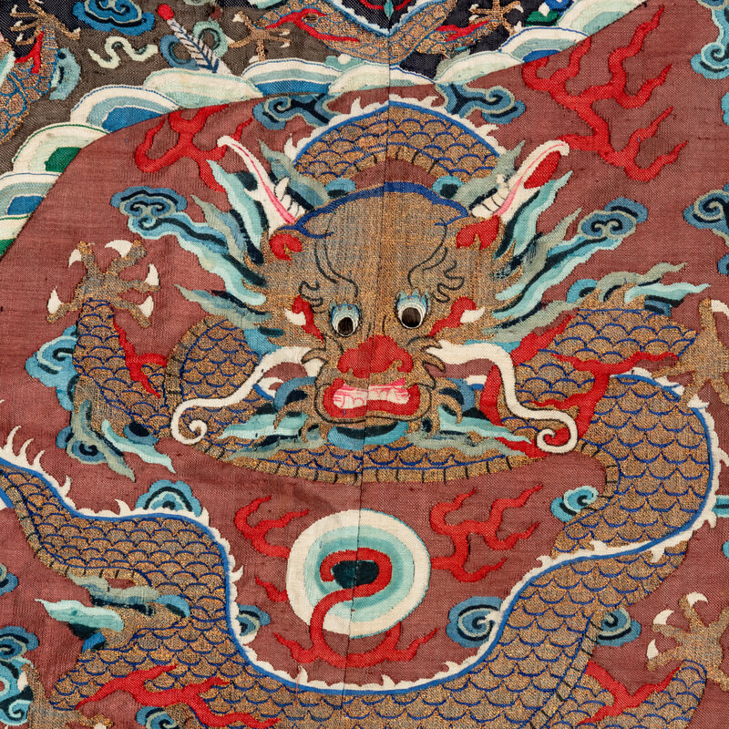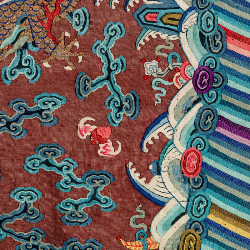 Woven with nine five-clawed dragons in pursuit of flaming pearls amidst multi-colored clusters of clouds, bats detailed in shades of red and pink, and the Eight Buddhist Emblems, all above rolling waves and a lishui border.
