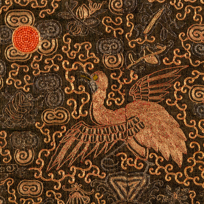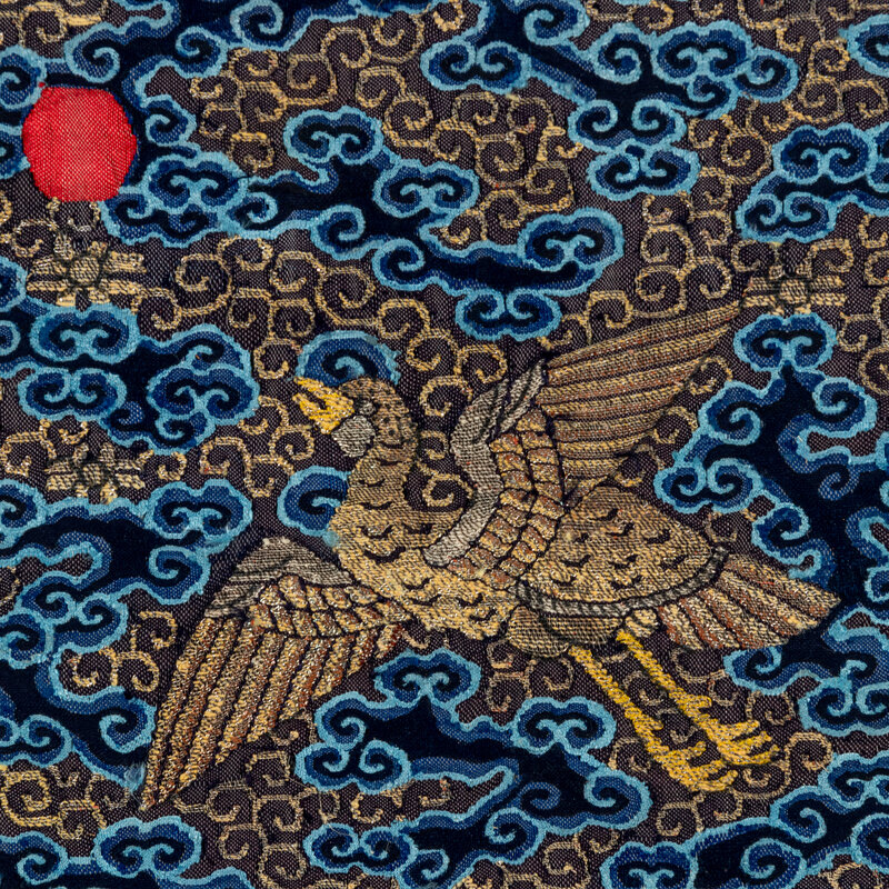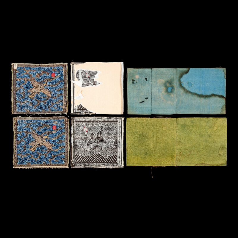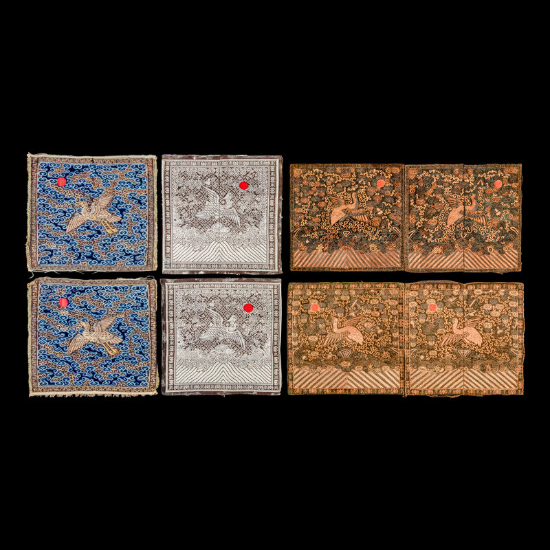 Comprising a pair of silk brocade 'mandarin duck' badges, Xianfeng-Tongzhi period (1851-1874); two pairs of embroidered 'quail' badges with gold metallic thread, Tongzhi period (1862-1874); and a pair of kesi silk 'quail' badges, Guangxu period (1875-1908).
