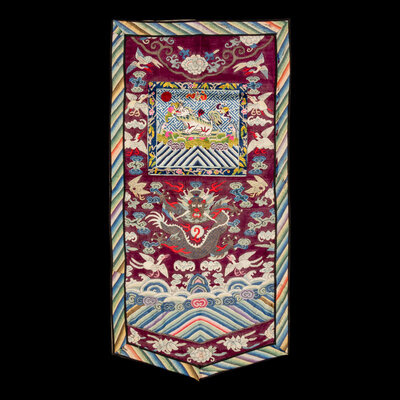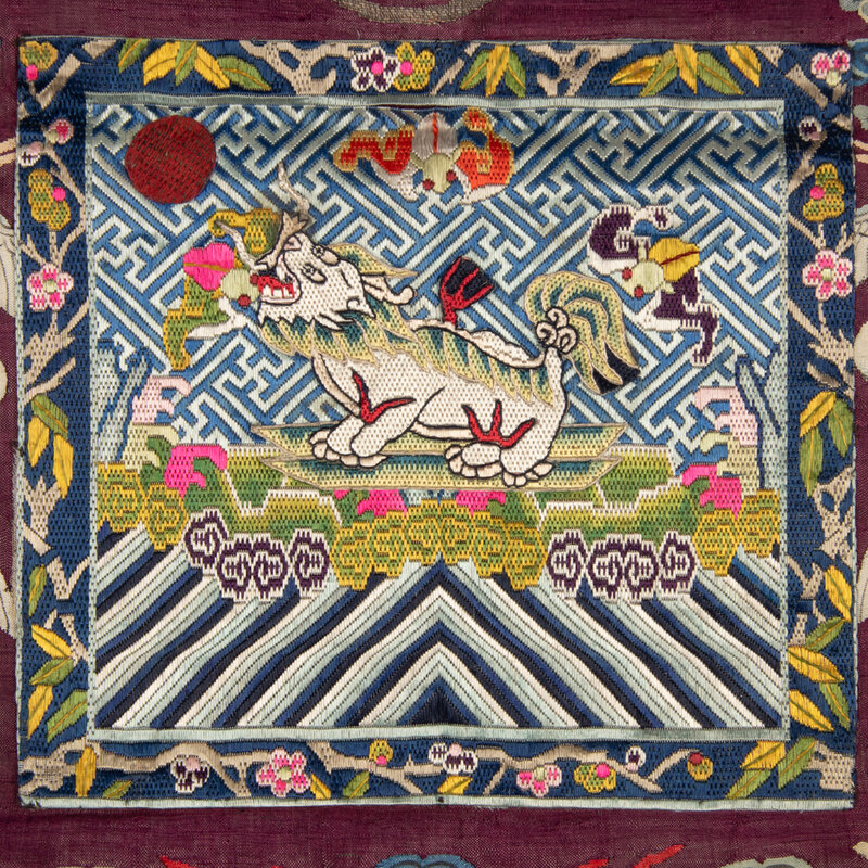 A Chinese Maroon Ground Embroidered and Kesi Silk 'Xiezhi' Rank Badge, Late 19th Century