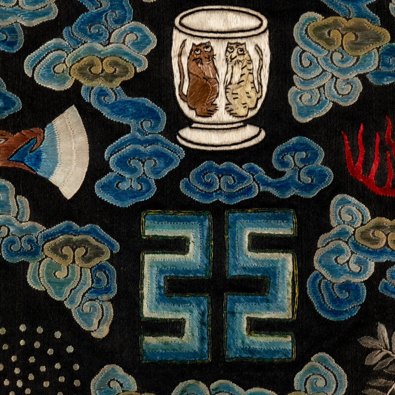 Worked in satin stitch in shades of blue, green, and coral, depicting a pair of cats to the top, a Ya character to the center, flame and axe to the sides, all against shape clouds background.