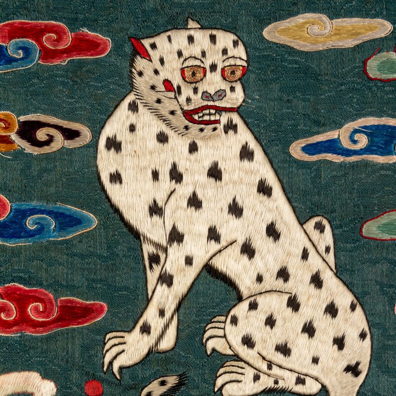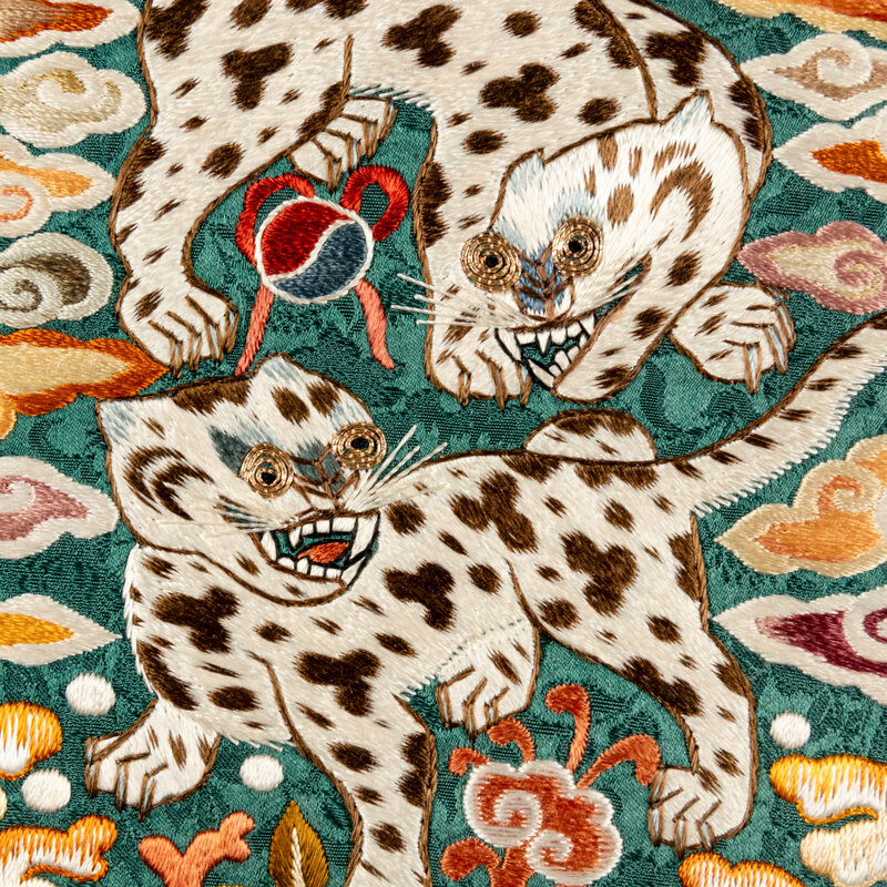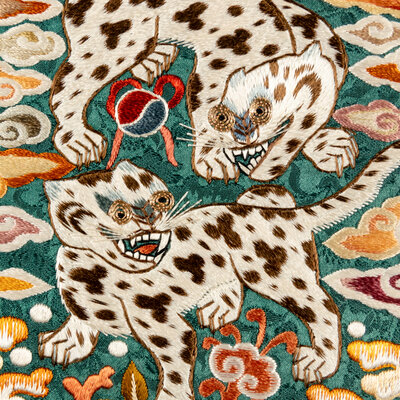 The first embroidered with two white leopards with brown spots and polychrome clouds and waves on a green silk ground. The second embroidered with a white leopard amongst clouds and cresting waves worked in polychrome silk embroidery on a dark green ground.