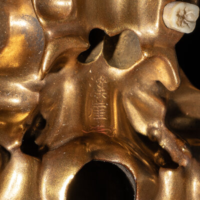With inlaid teeth and an autumn maple design on the top of the skull. Marked 溪崖.