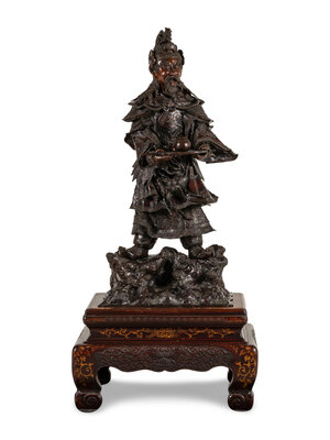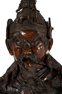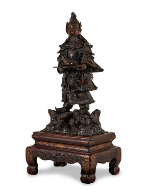 This large figure of Ryujin is related to two celebrated sculptural groups, one showing Susano-o and Haneakarutama no Mikoto, the other showing Takenouchi no Sukune and Ryujin, in the Khalili and John R. Young collections respectively. The latter, by Oshima Joun, was made for the second Naikoku Kangyo Hakurankai (National Industrial Exposition) held in 1881. Two sets of drawings by Kawanabe Kyosai (1831-1889) are closely related to this group of bronzes.