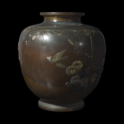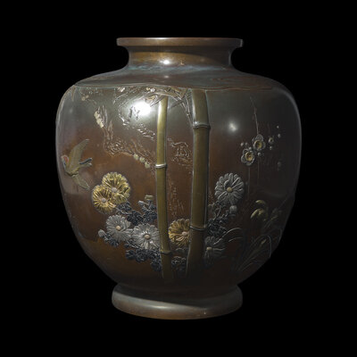 A Large Japanese Mixed-Metal 'Birds, Chrysanthemums and Bamboo' Vase, Meiji/Taisho Period