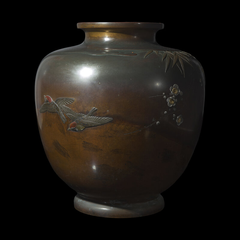 Signed Saida Kozo saku, of swelling ovoid form with a short everted neck, the body patinated to simulate reddish-brown iron, inlaid in gold, silver, copper shakudo, and shibuichi with swallows flying past bamboos and chrysanthemums. With incised signature and gold inlaid seal Jyunkyo-do to the side, underside with cast mark Jyunkyo-do.