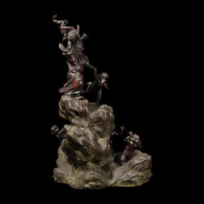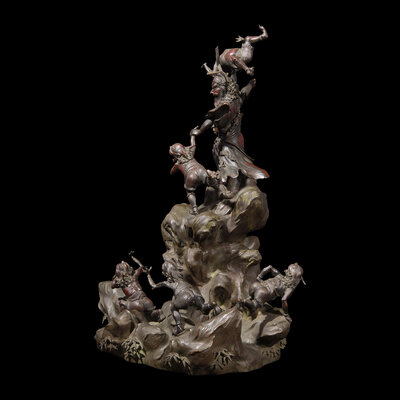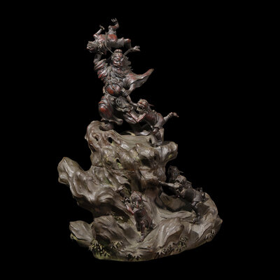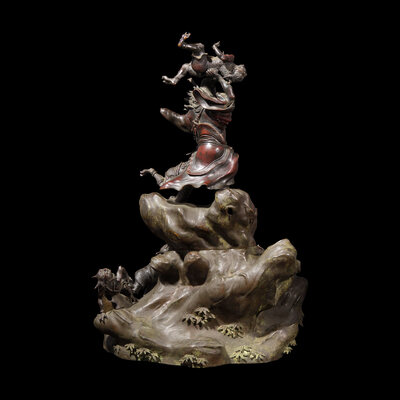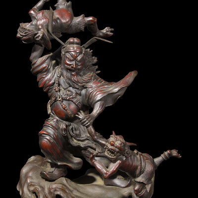A Japanese Patinated Bronze and Metal Shoki and Oni Figural Koro, Meiji Period