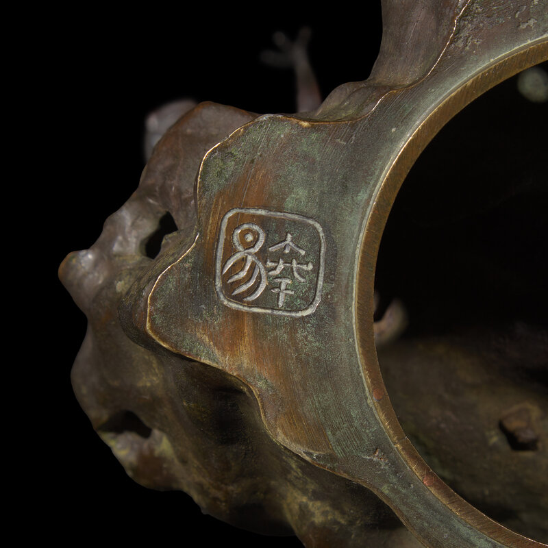 In two sections, depicting the deity in fierce battle with a group of cowering oni on pierced rockwork, with incised signature (Hoeki or Koeki) to the underside of the cover, dark red brown and greenish-brown patina.