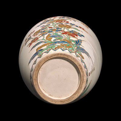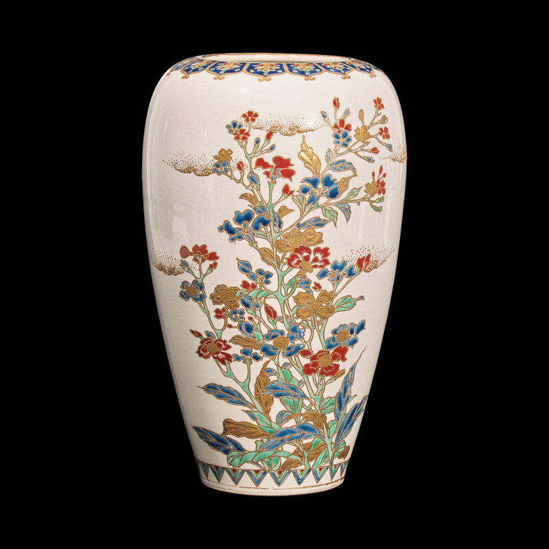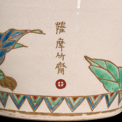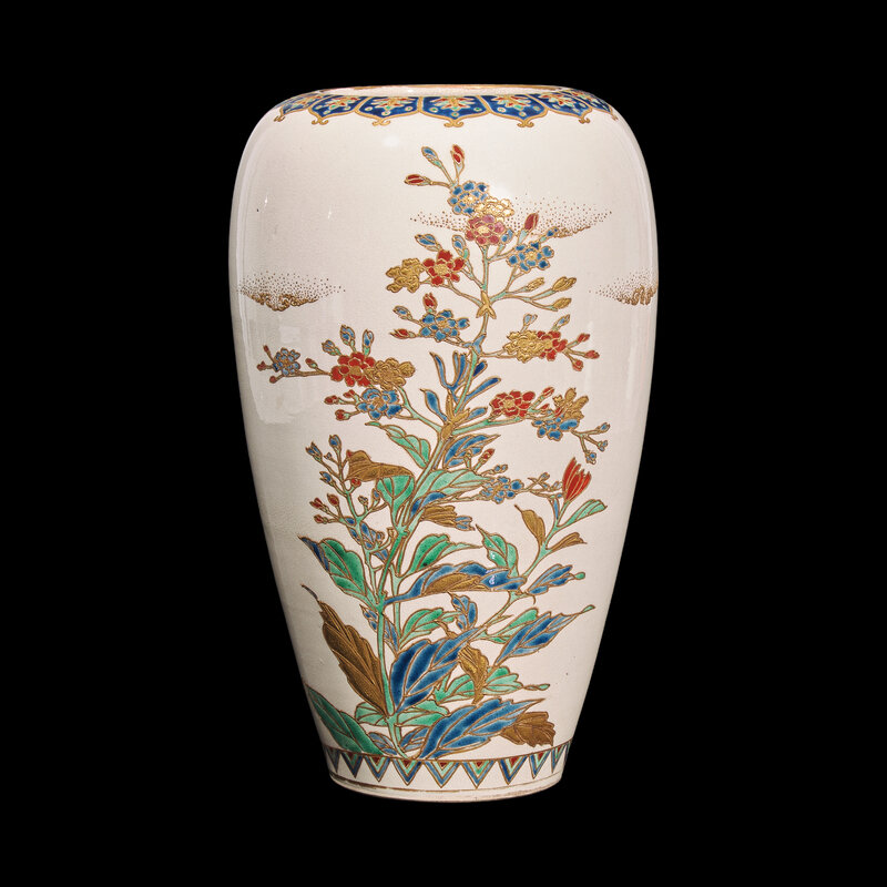 The ovoid vase decorated with flowers and stylized clouds, incorporating gosu blue; lappet borders to rim and foot, side inscribed Satsuma Chikusan and with Shimazu family crest.
