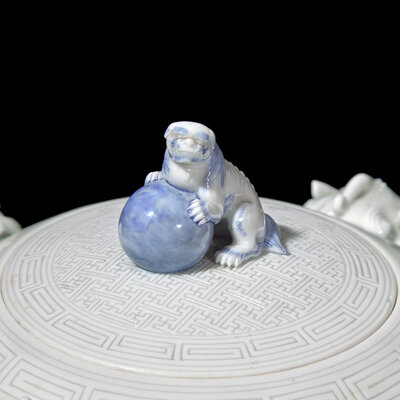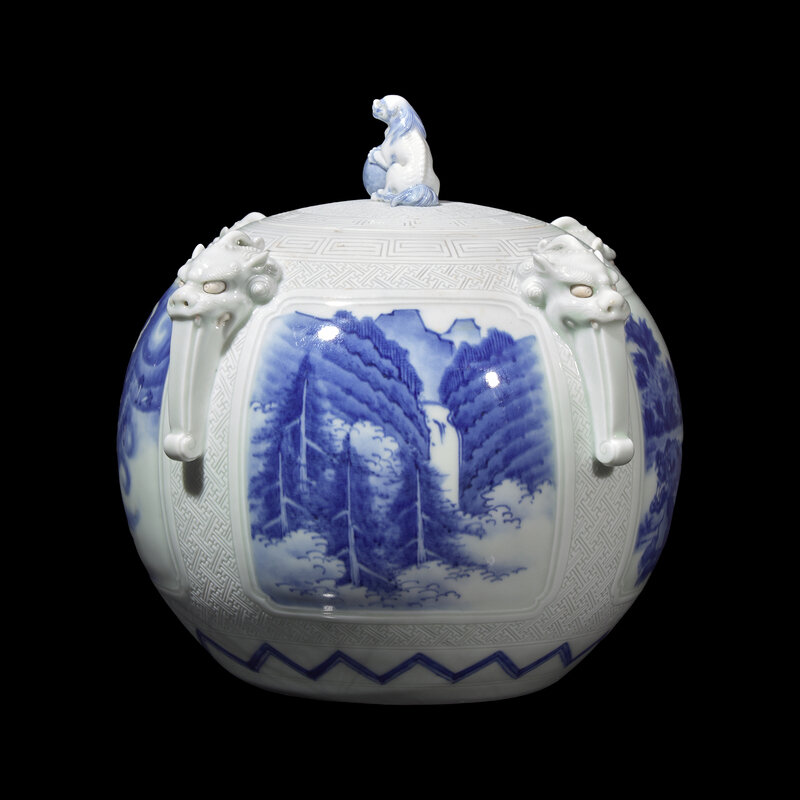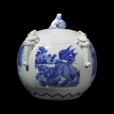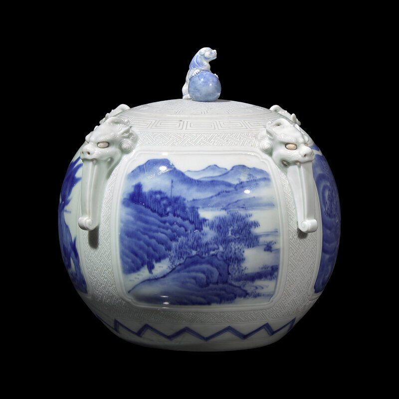 The spherical jar with shishi and ball finial to the fret-carved cover, the shoulder with four applied beast-head "handles", body decorated with four reserves, one with dragon, another with shishi, separated by two landscape panels, all against a carved fret ground.