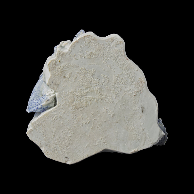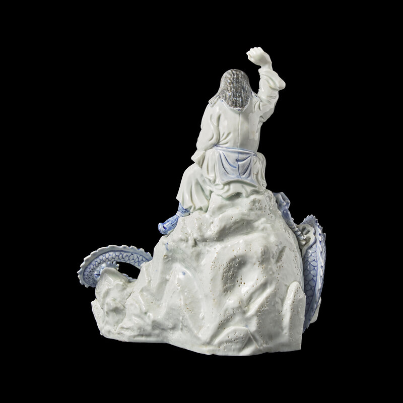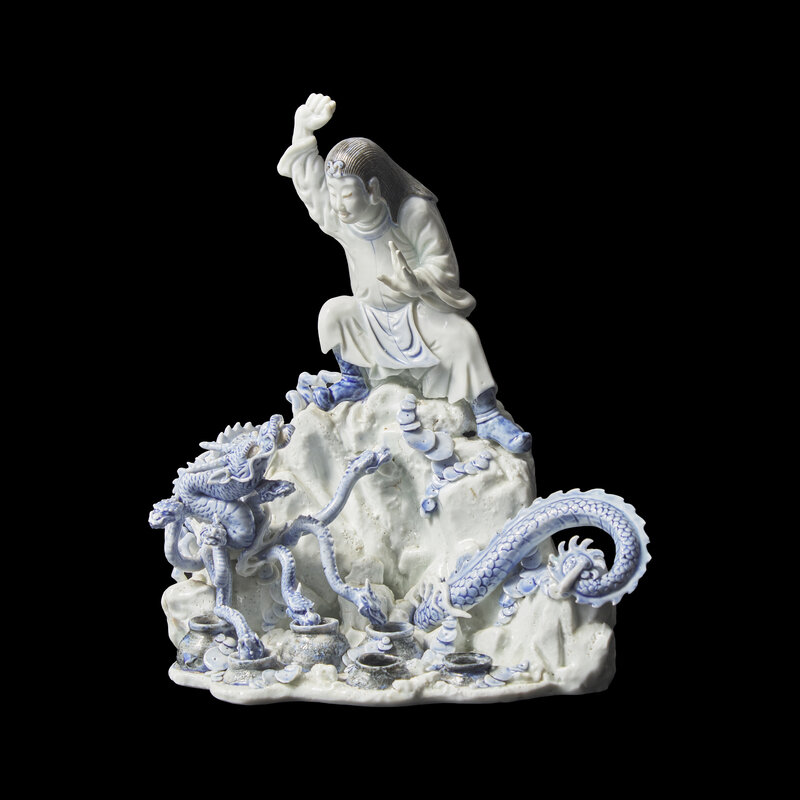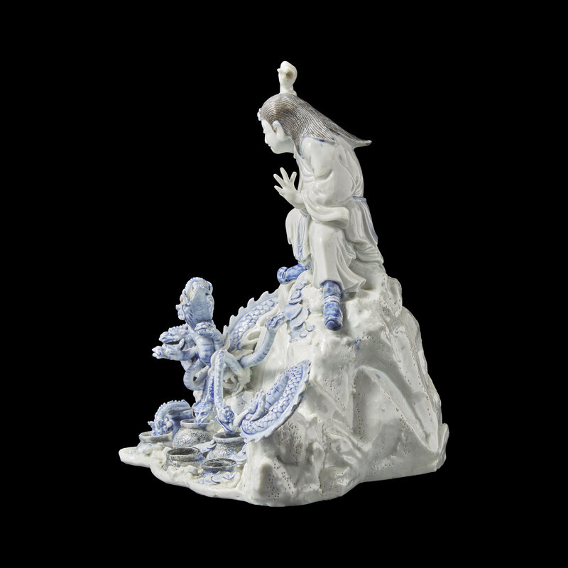 Finely modeled as the eight-headed dragon Yamata no Orochi, borne on coins and five jars of spirits, drunkenly looking at the Shinto storm god Susa-no-o on top of a rock preparing to slay him, decorated in underglaze blue, the jars and hat of the figure heightened with black.