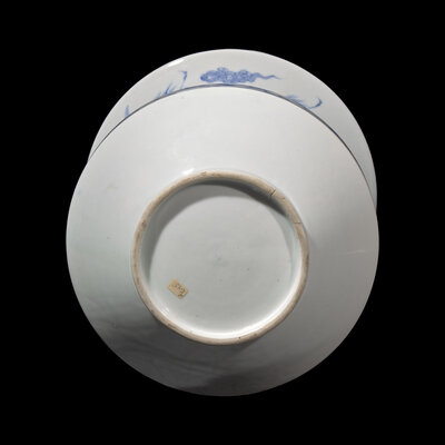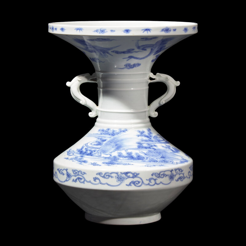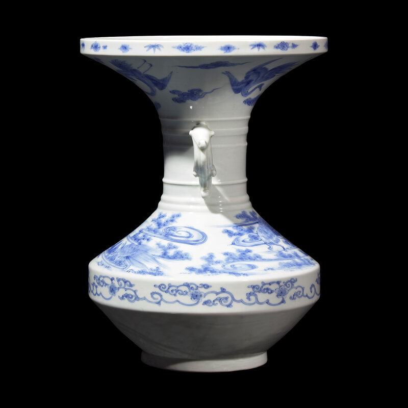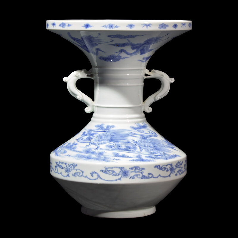 With wide flared lip over a cylindrical body with sloped shoulder and base, stylized 'Dragon' handles, decorated with flying cranes among cloud scrolls, and minogami among pine and water scrolls.