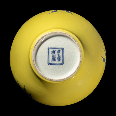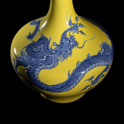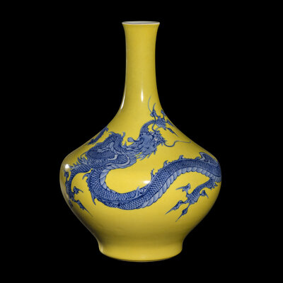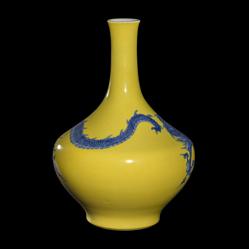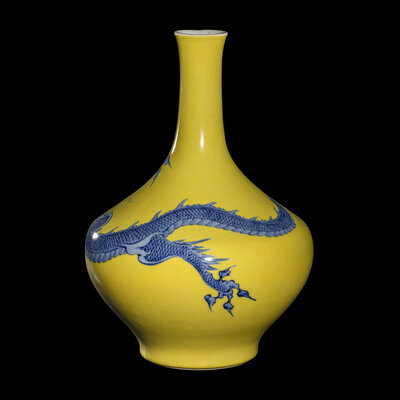 The lower bulbous section is enameled in underglaze blue with a serpentine dragon trailing from the neck and shoulder and extending across the body, all reserved on a yellow ground, signed on the base in underglaze blue.