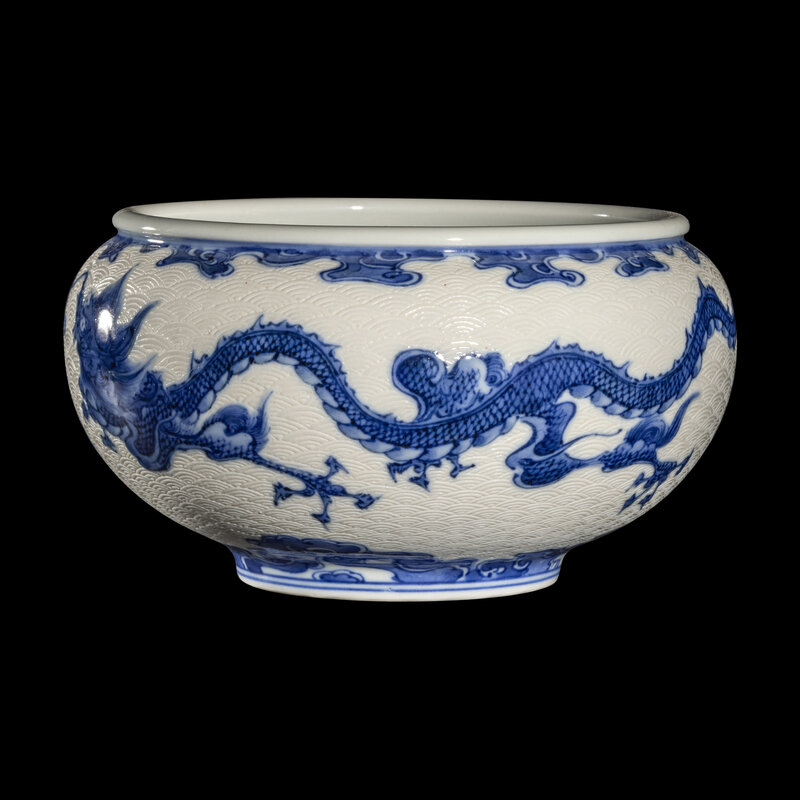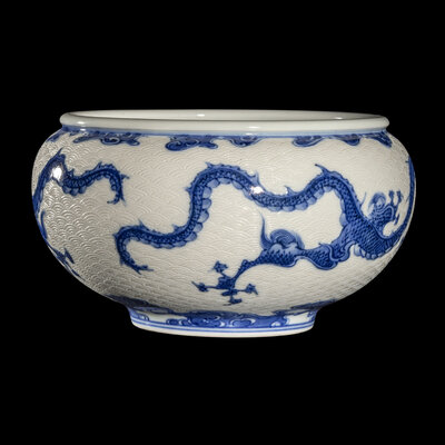 The deep, tapered form body is decorated in underglaze blue with two dragons, against an incised wave ground, the bottom is signed in seal form Makuzu Kozan sei.