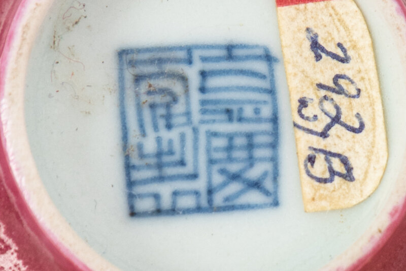 Each is supported with a circular foot, rising to straight upright walls, covered in a crushed raspberry glaze, the mouth rim, interior, and base white.