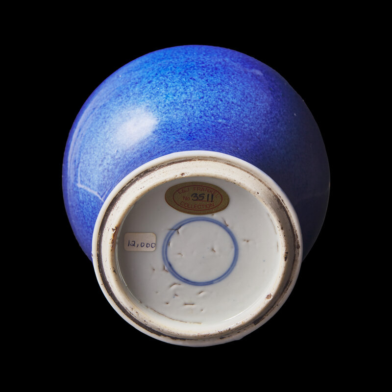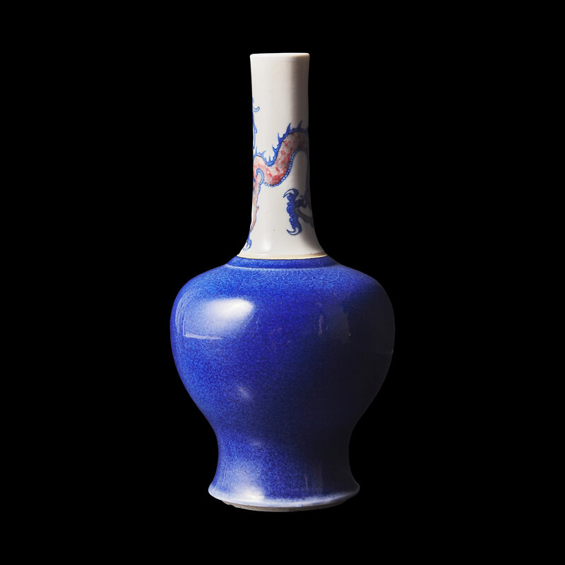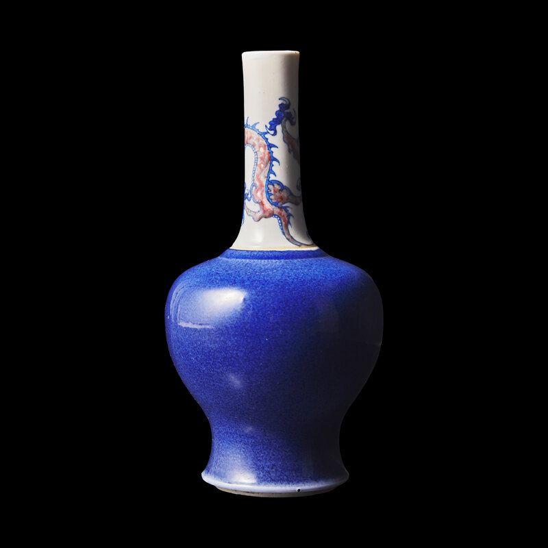 Potted with an elongated neck painted with a crouching three-clawed dragon in underglaze blue and copper red. The bulbous shoulders are covered in powder blue glaze, incised with a band of wave decoration.