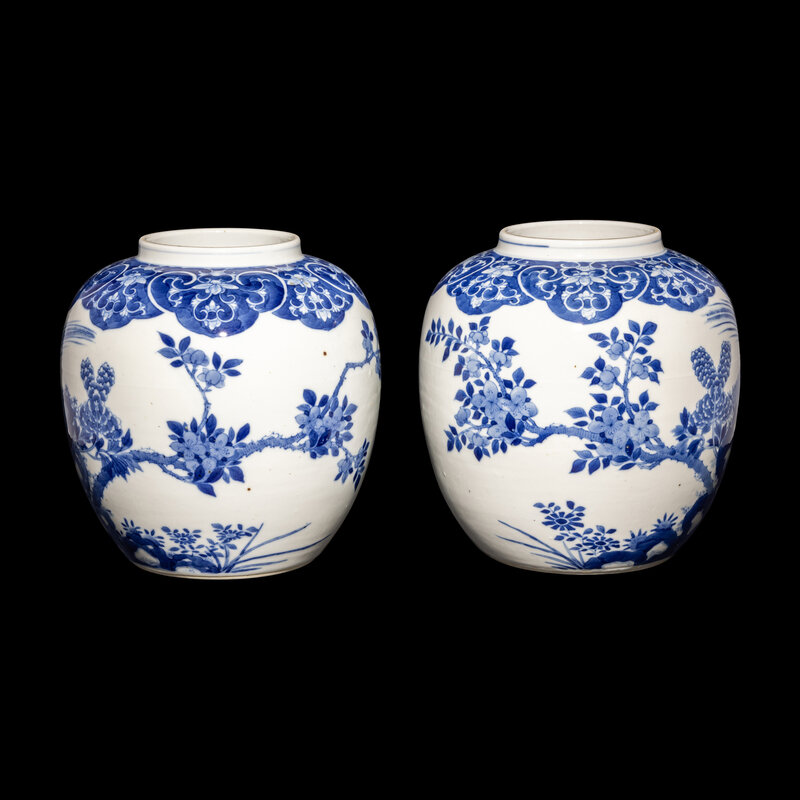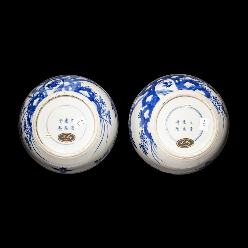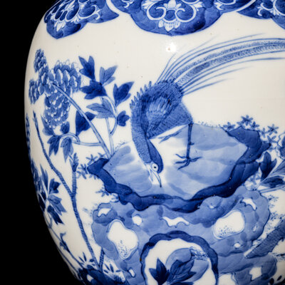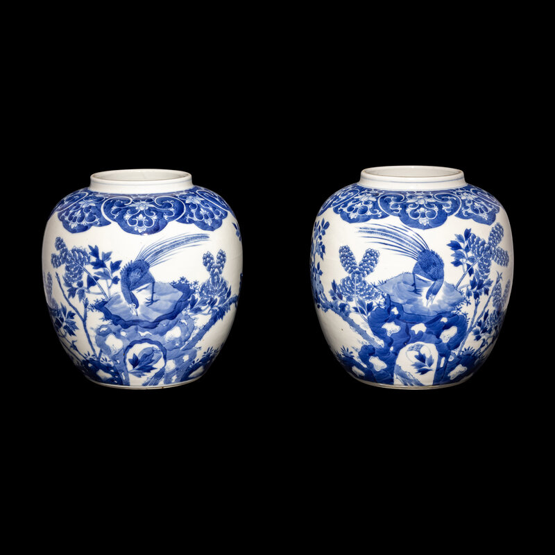 Each ovoid body is painted in delicate shades of blue depicting a large pheasant perched on a jagged rock amidst clusters of peony blossoms.