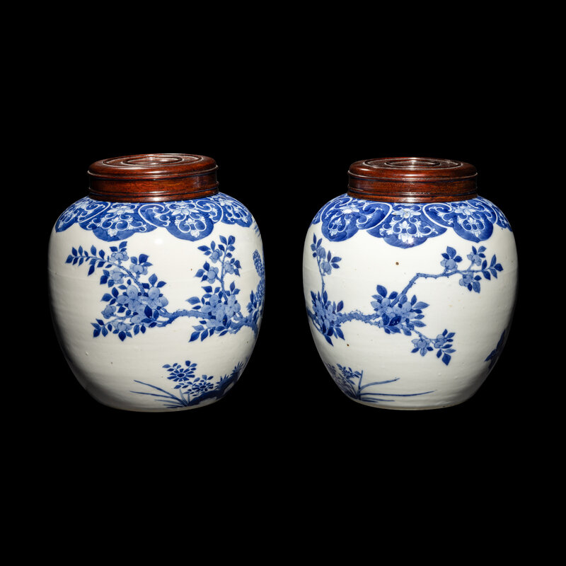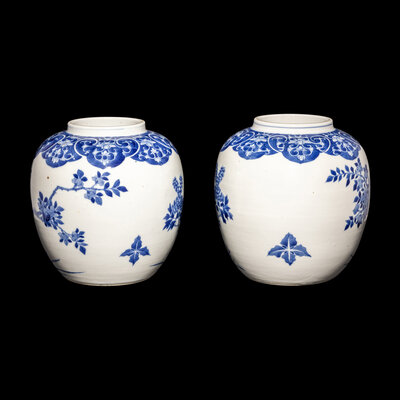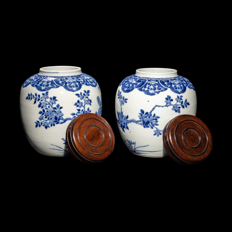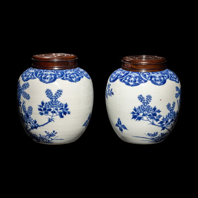 清光緒 青花牡丹錦鷄圖蓋罐一對