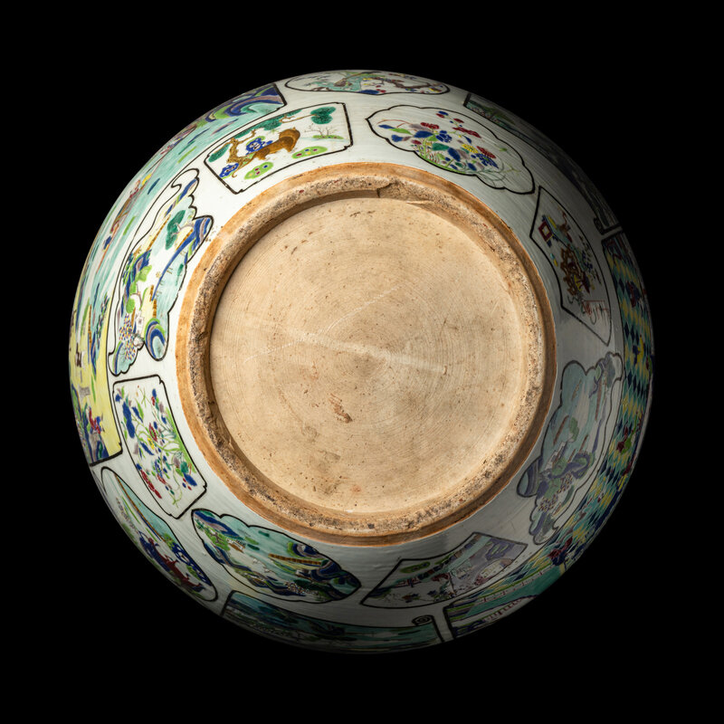 Richly enameled with leaf, bat, and handscroll-shaped panels, enclosing birds and flowers, bogu motifs, and boys in a garden.