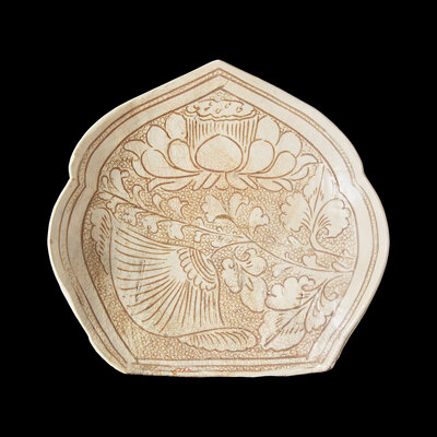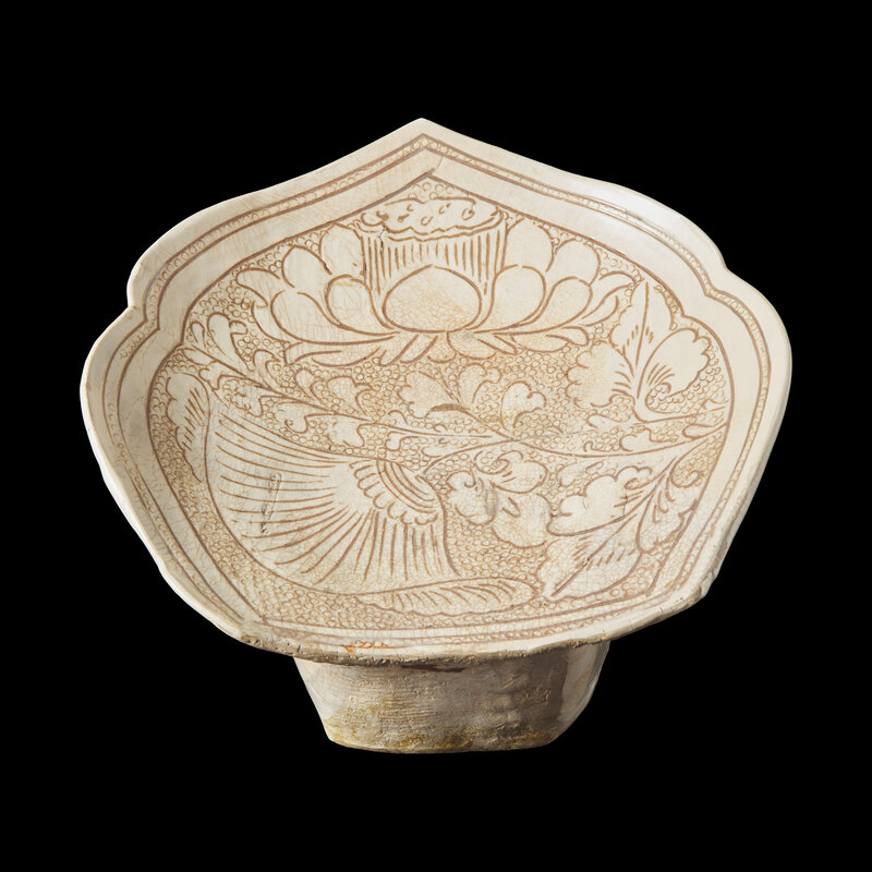 With a shaped trefoil top and a pentagonal base, incised with a lotus flower borne on a leafing stem reserved against a 'fish-roe' ground, enclosed within a double-line border. All incised through the creamy-white slip revealed the buff-colored body, covered with a clear glaze.