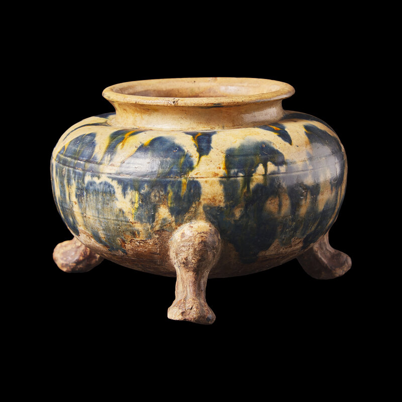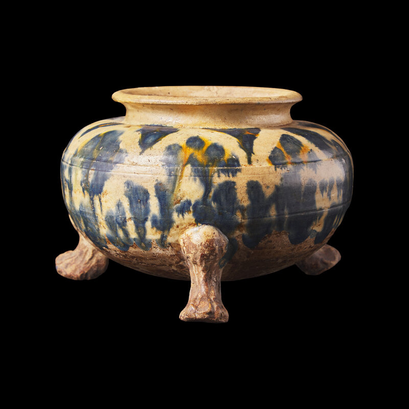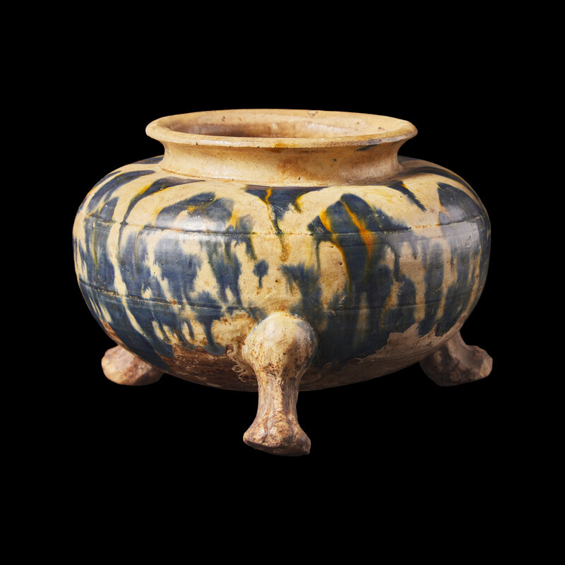 A Rare Chinese Blue and Amber-Splashed Tripod Vessel, Probably Tang Dynasty