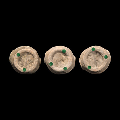 Three Chinese Painted Grey Pottery Pear-Shaped Covered Hu Vessels, Han Dynasty