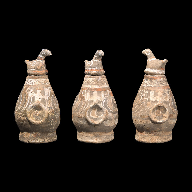 Each with a pair of molded looped handles to the body and a bird form finial. Decorated in red, grey, and white color in geometric and swirling cloud-shape design.