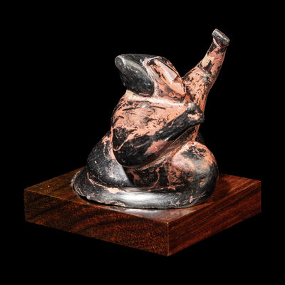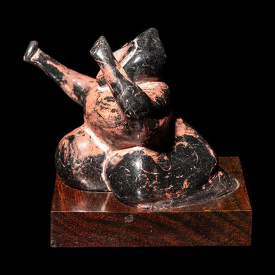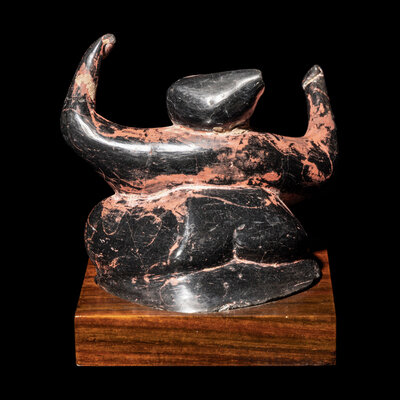 Modeled as a crouching dancing figure with arms in the air.