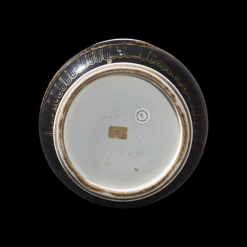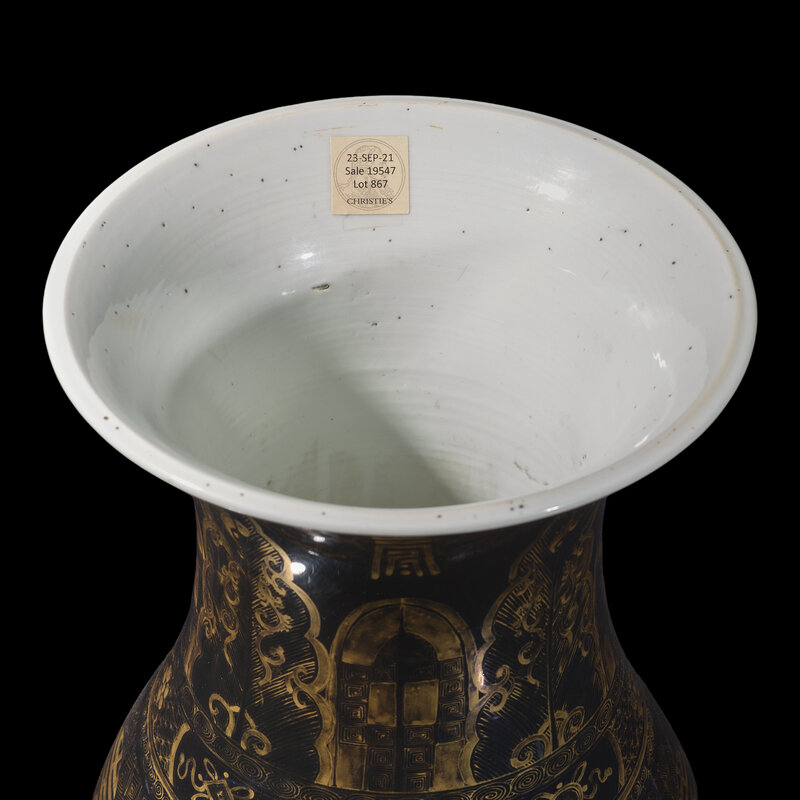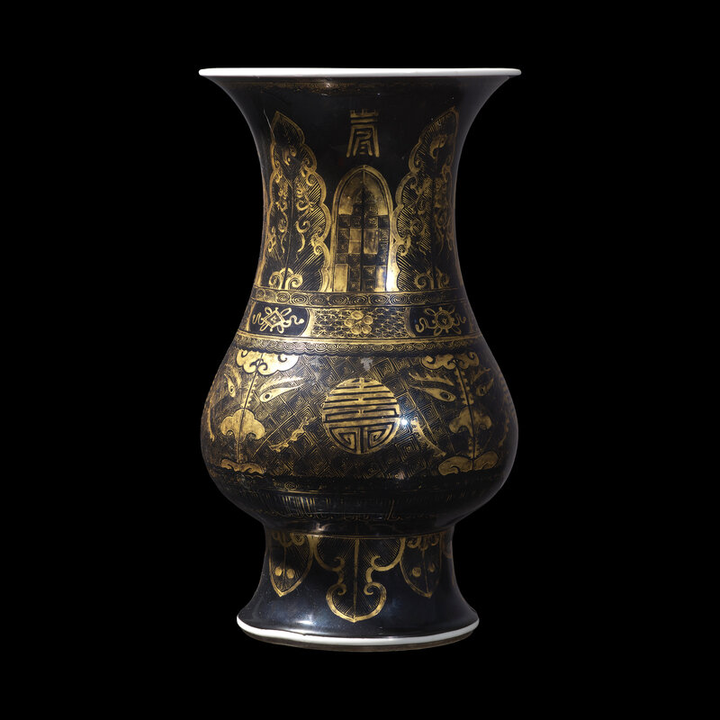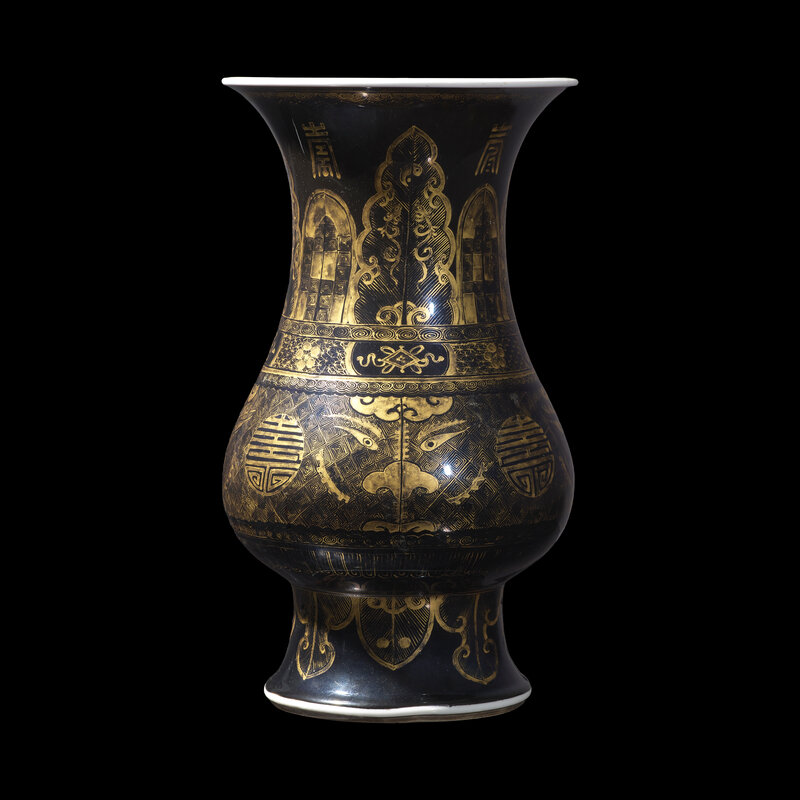 The broad pear-shaped body is decorated with alternating gilt taotie masks and shou-character roundels, the flaring neck is decorated with plantain leaves alternating with lappets and shou characters, all reserved on a luminous black glaze.