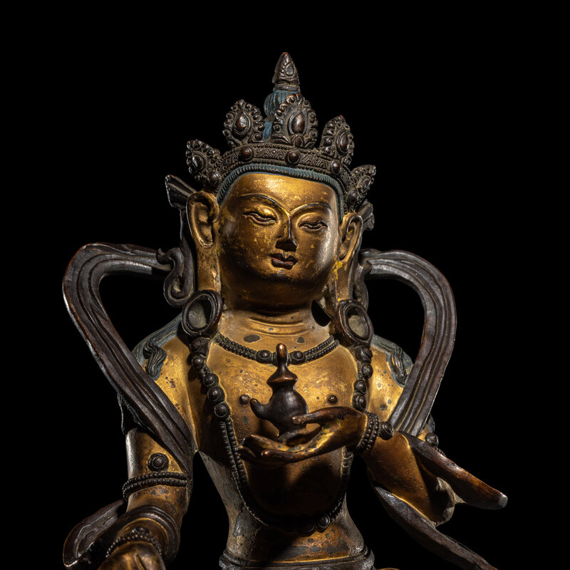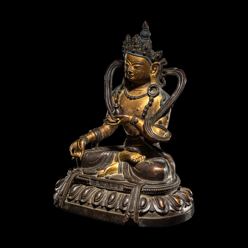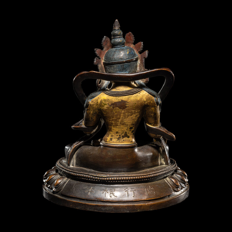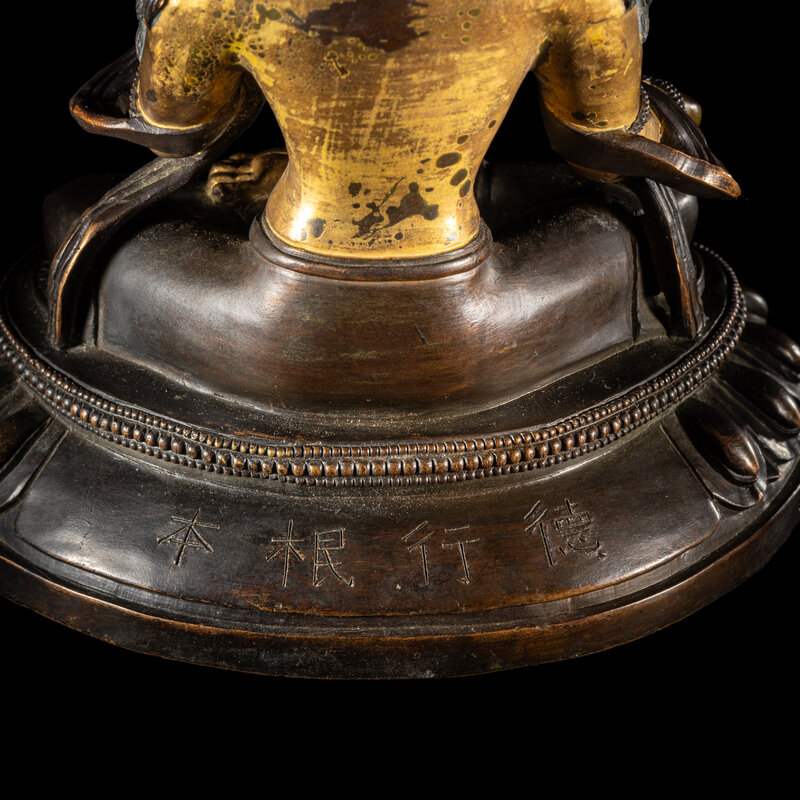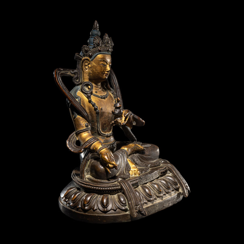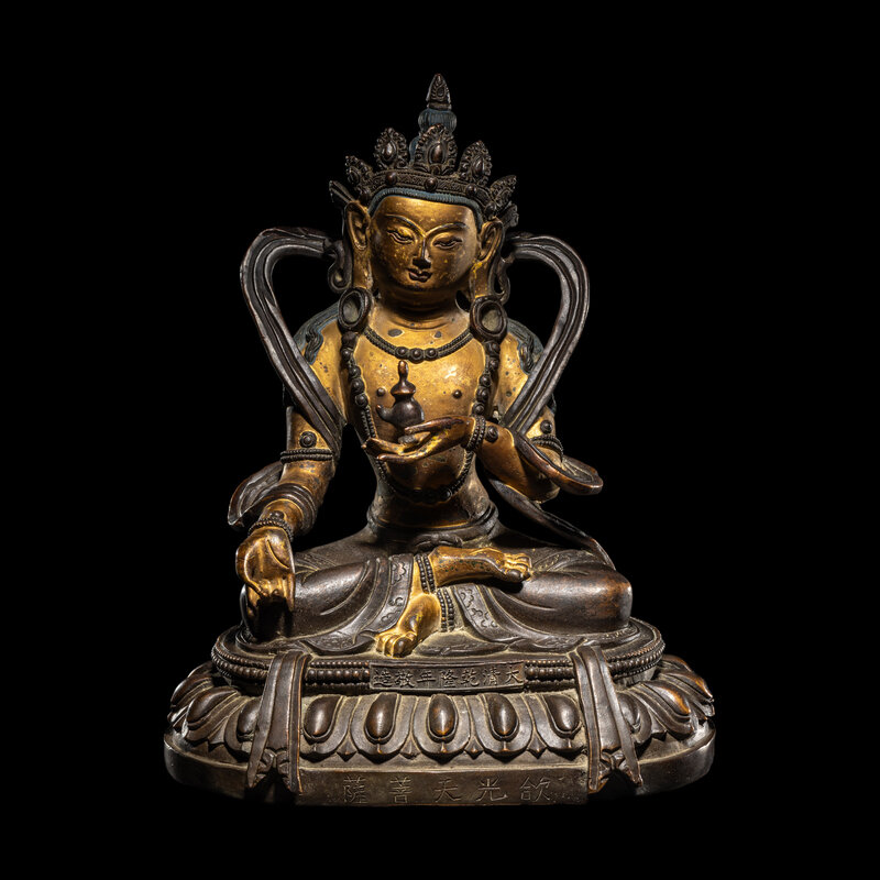 Possibly from Liu pin fo lou (Building of Six Classes of Sutra and Tantra). The bodhisattva cast seated on a lotus base holding a kendi on the right hand, the naked upper torso adorned with beaded jewelry and a flowing scarf wrapped around both arms, wearing a flowing dhoti, the calm face flanked by a pair of elongated earlobes and large pendant earrings, all underneath a five-point crown set in front of a tiered topknot; the front of the lotus base cast with a Qianlong six-character mark with a horizontal rectangular panel, the lower rim of the base incised with five characters reading he guang tian pu sa.
