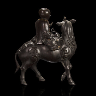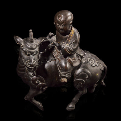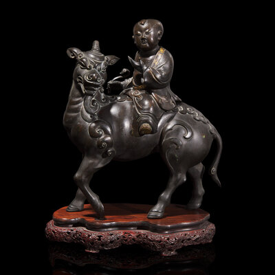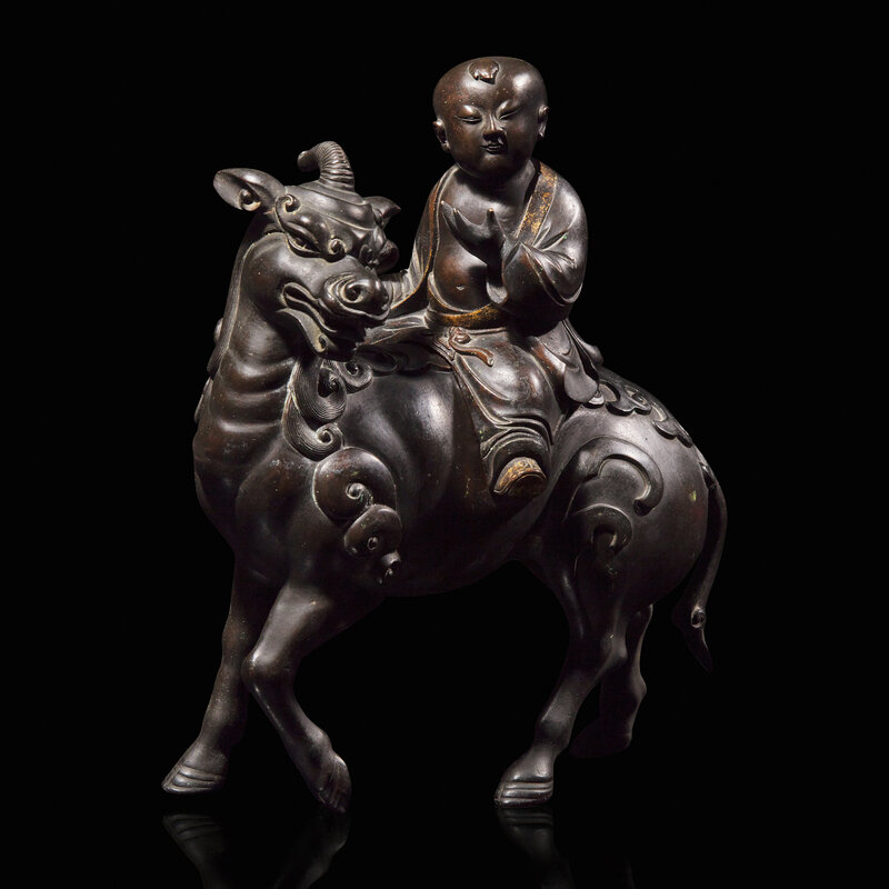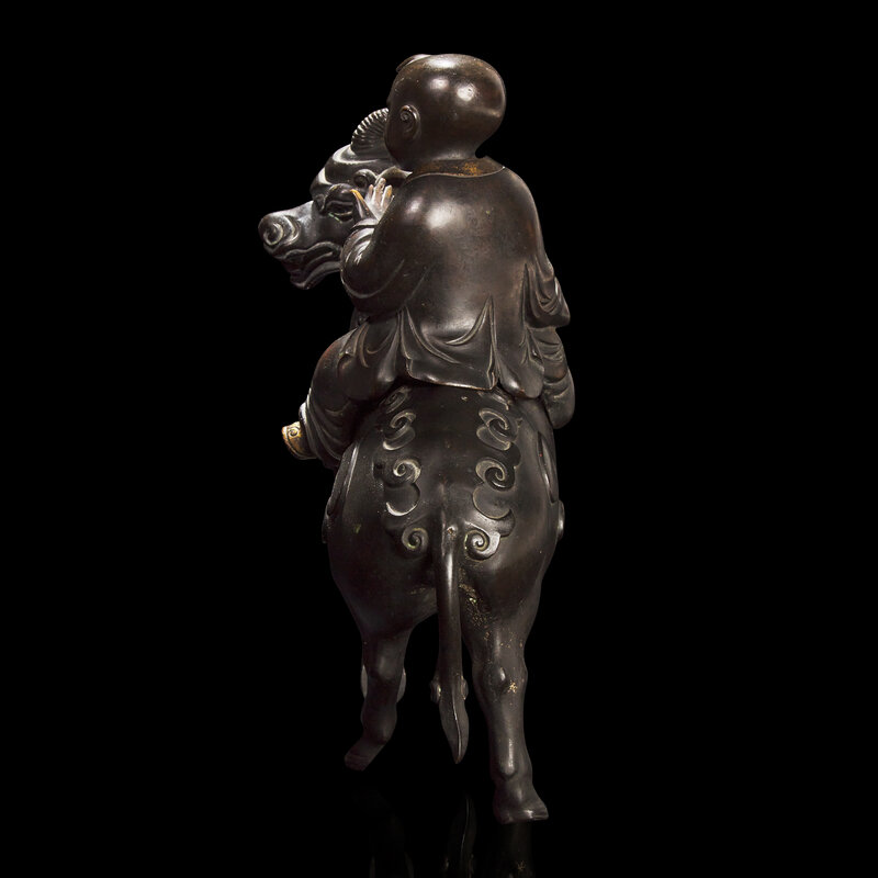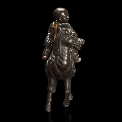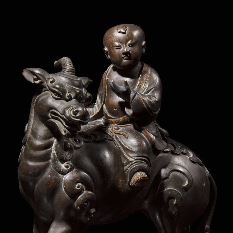 Modelled in the form of a young boy with parcel-gilt border to his open robe and parcel-gilt shoes; seated on the back of a Qilin with stylized mane and tail, dark brown-black patina. With a later associated carved hardwood stand said to be from a Japanese Exposition of 1917.