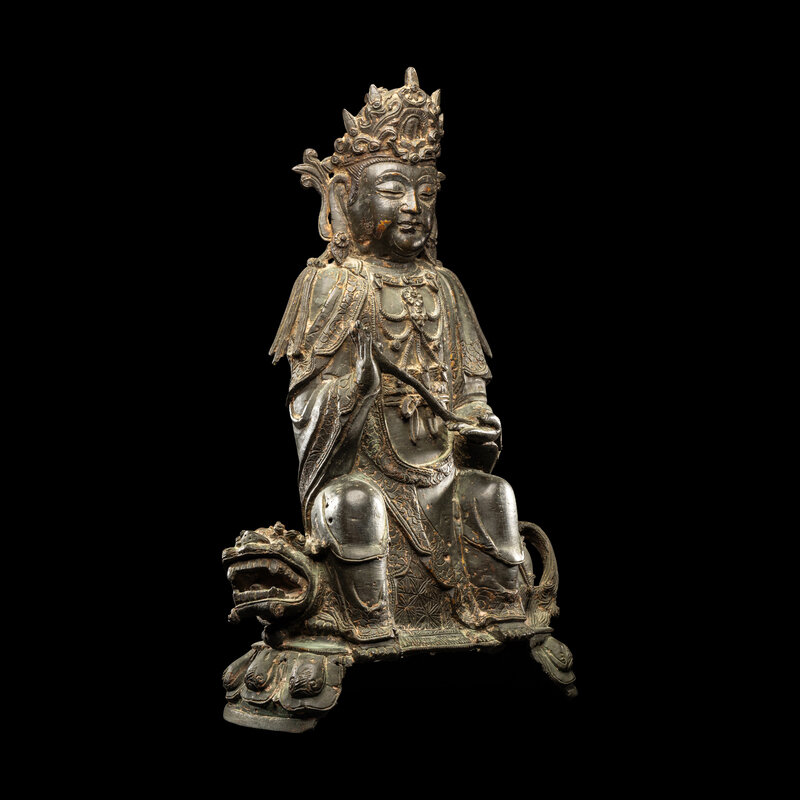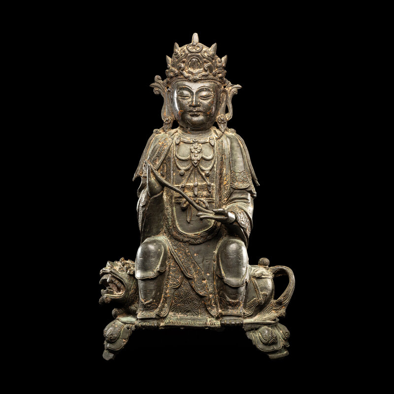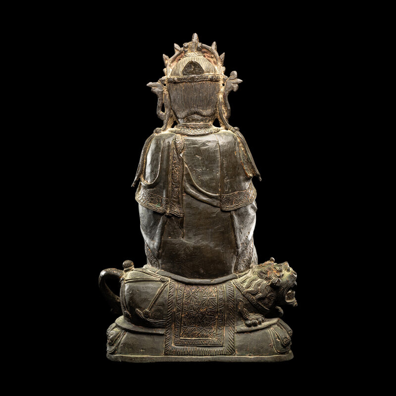 Grasping a lingzhi stem in both hands, wearing a long flowing robe, the open chest draped in an elaborate necklace, the face with a benevolent expression detailed with downcast eyes beneath high arched brows and above a bud mouth, flanked by long pendulous ears and surmounted by a crown, all seated on a lion on lotus petal lappet base.