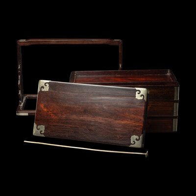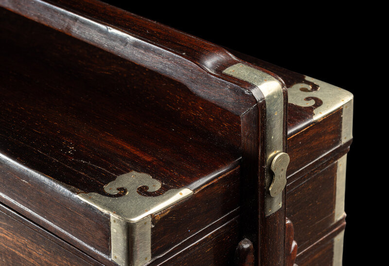 Of rectangular form, comprising a cover and three trays set on a base frame flanked by standing spandrels joined at the top with a humpbacked handle, the cover with corner ruyi-head mounts and opening to reveal a shallow fitted inner tray, the edge of the cover, base frame, trays and handle reinforced by metal mounts.